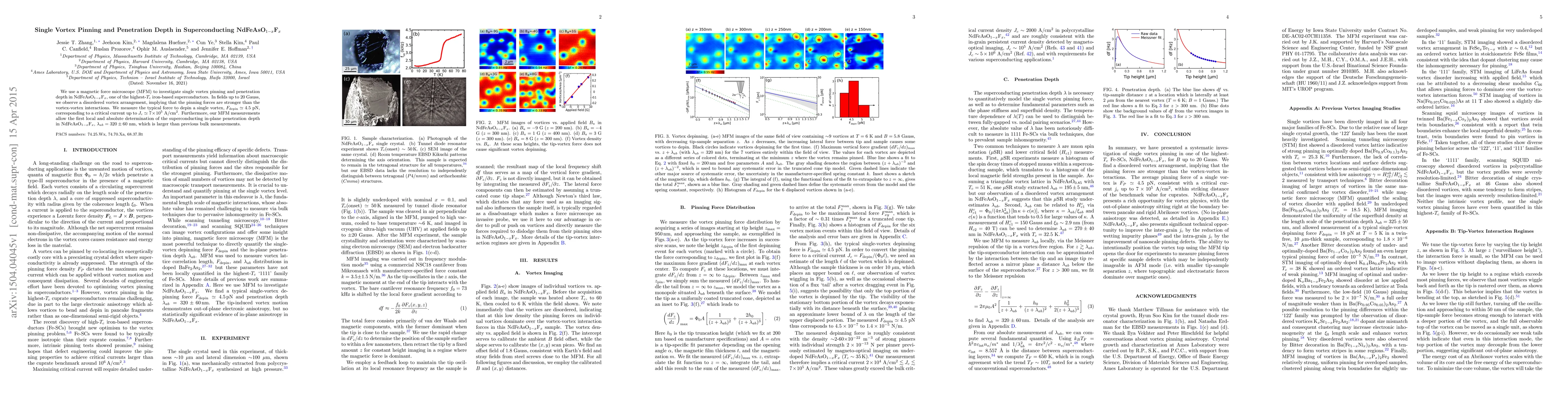 This paper investigates single vortex pinning and penetration depth in NdFeAsO$_{1-x}$F$_x$ using a magnetic force microscope, revealing stronger pinning forces than vortex-vortex interactions. The study determines a local in-plane penetration depth of $\lambda_{ab}=320 \pm 60$ nm, surpassing previous bulk measurements.