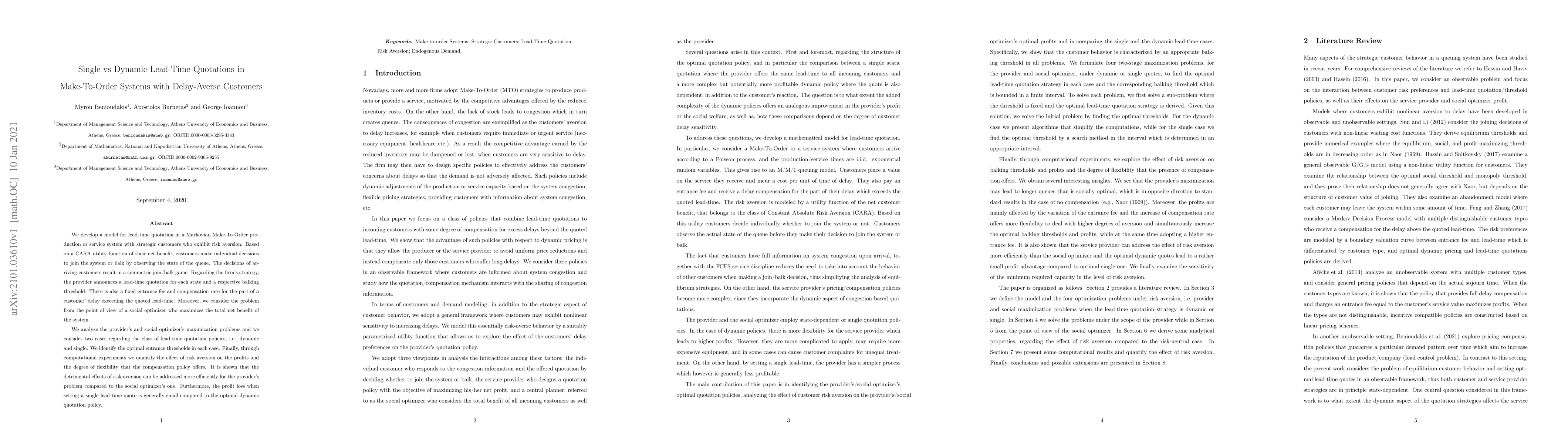 We develop a model for lead-time quotation in a Markovian make-to-order production or service system with strategic customers who exhibit risk aversion. Based on a CARA utility function of their net benefit, customers make individual decisions to join the system or balk by observing the state of the queue. The decisions of arriving customers result in a symmetric join/balk game. Regarding the firm's strategy, the provider announces a lead-time quotation for each state and a respective balking threshold. There is also a fixed entrance fee and compensation rate for the part of a customer' delay exceeding the quoted lead-time. Moreover, we consider the problem from the point of view of a social optimizer who maximizes the total net benefit of the system. We analyze the provider's and social optimizer's maximization problems and we consider two cases regarding the class of lead-time quotation policies, i.e., dynamic and single. We identify the optimal entrance thresholds in each case. Finally, through computational experiments we quantify the effect of risk aversion on the profits and the degree of flexibility that the compensation policy offers. It is shown that the detrimental effects of risk aversion can be addressed more efficiently for the provider's problem compared to the social optimizer's one. Furthermore, the profit loss when setting a single lead-time quote is generally small compared to the optimal dynamic quotation policy.