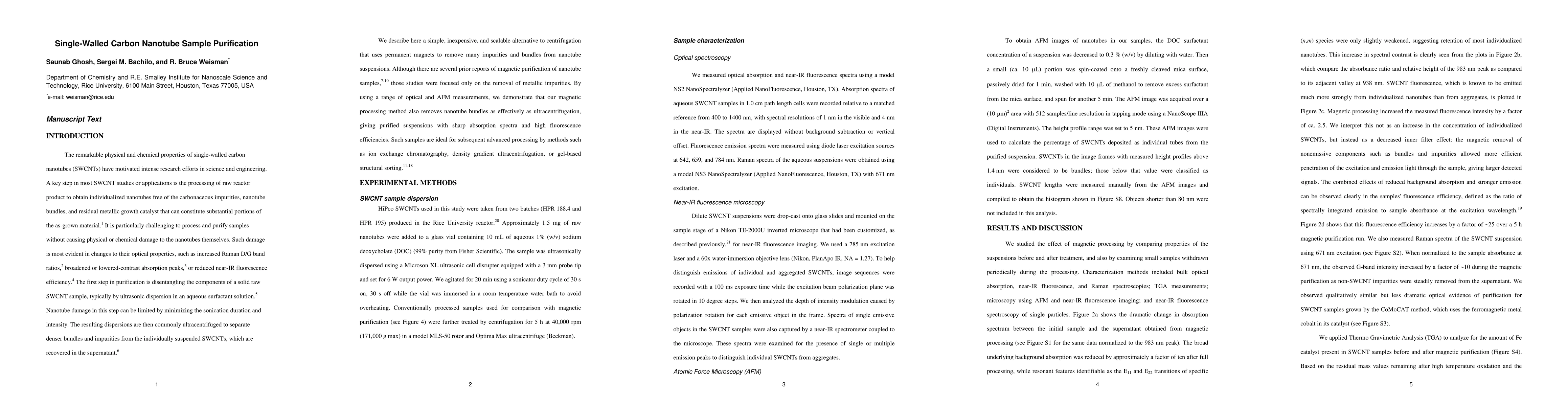 This paper presents a simple magnetic purification method for removing impurities and aggregates from single-walled carbon nanotubes (SWCNTs), achieving individualized nanotubes at least 80% of the time. The method outperforms ultracentrifugation in cost, simplicity, energy use, and scalability.