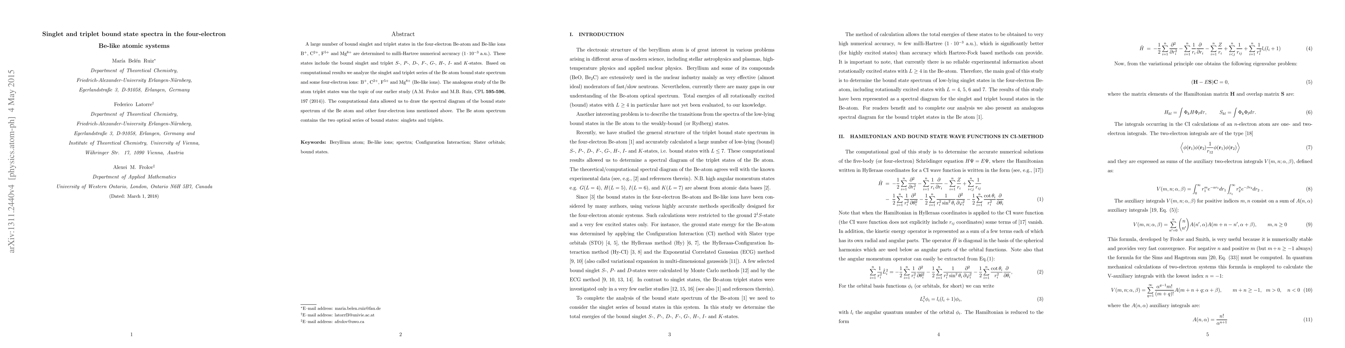 A large number of bound singlet and triplet states in the four-electron Be-atom and Be-like ions B$^+$, C$^{2+}$, F$^{5+}$ and Mg$^{8+}$ are determined to milli-Hartree numerical accuracy ($1\cdot 10^{-3}$ a.u.). These states include the bound singlet and triplet $S$-, $P$-, $D$-, $F$-, $G$-, $H$-, $I$- and $K$-states. Based on computational results we analyze the singlet and triplet series of the Be atom bound state spectrum and some four-electron ions: B$^+$, C$^{2+}$, F$^{5+}$ and Mg$^{8+}$ (Be-like ions). The analogous study of the Be atom triplet states was the topic of our earlier study (A.M. Frolov and M.B. Ruiz, CPL 595-596, 197 (2014)). The computational data allowed us to draw the spectral diagram of the bound state spectrum of the Be-atom and other four-electron ions mentioned above. The Be-atom spectrum contains the two optical series of bound states: singlets and triplets.