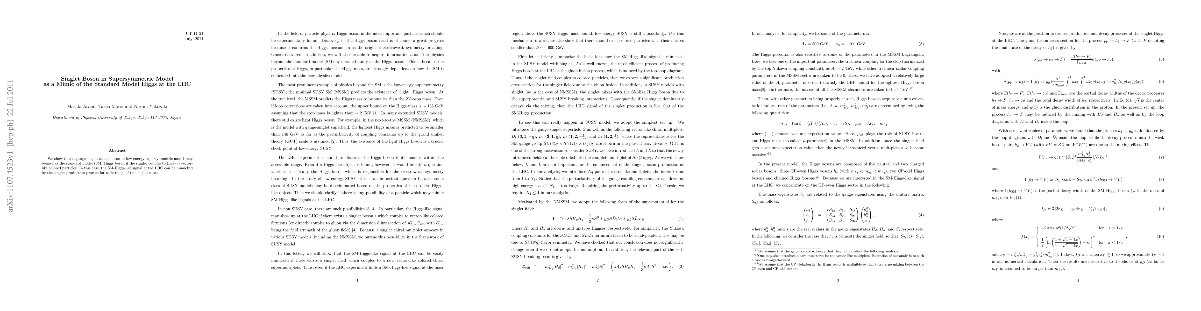Summary: This paper demonstrates that a gauge singlet scalar boson in a low-energy supersymmetric model can mimic the Standard Model Higgs boson when it couples with heavy vector-like colored particles, potentially producing similar signals at the LHC across a broad range of singlet masses.