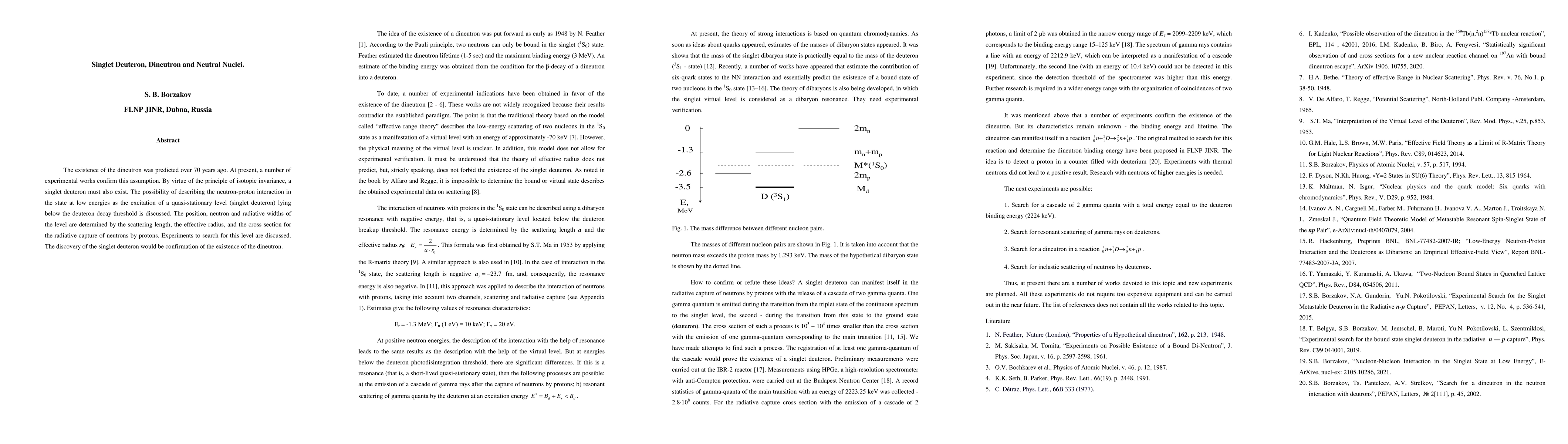 This paper discusses the theoretical prediction and experimental search for a singlet deuteron, a quasi-stationary level below the deuteron decay threshold, which would confirm the existence of a dineutron. The study determines its position, neutron, and radiative widths based on scattering length and cross-section data.