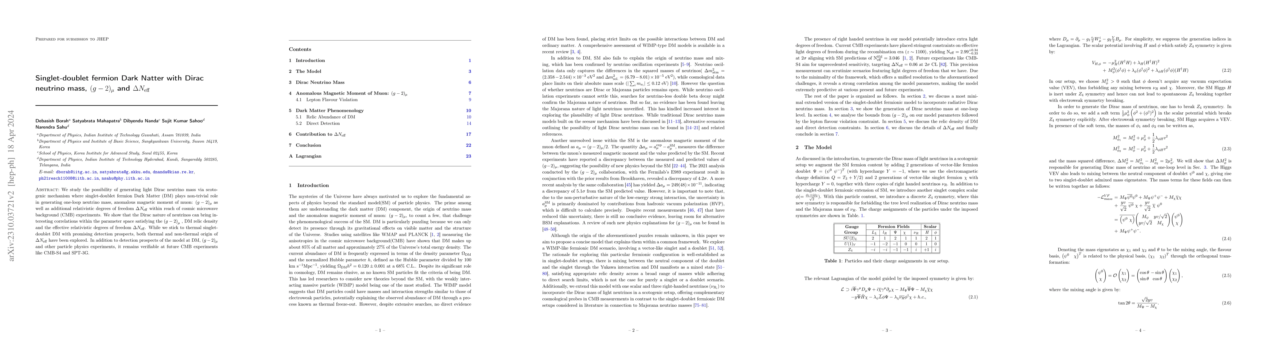 This paper explores a scotogenic model generating light Dirac neutrino mass through a singlet-doublet fermion dark matter mechanism, addressing the muon anomalous magnetic moment $(g-2)_\mu$ and additional relativistic degrees of freedom $\Delta N_{\rm eff}$ in line with CMB data. The model's parameters correlate to satisfy observed $(g-2)_\mu$, DM relic density, and $\Delta N_{\rm eff}$, with potential verification in future CMB experiments.