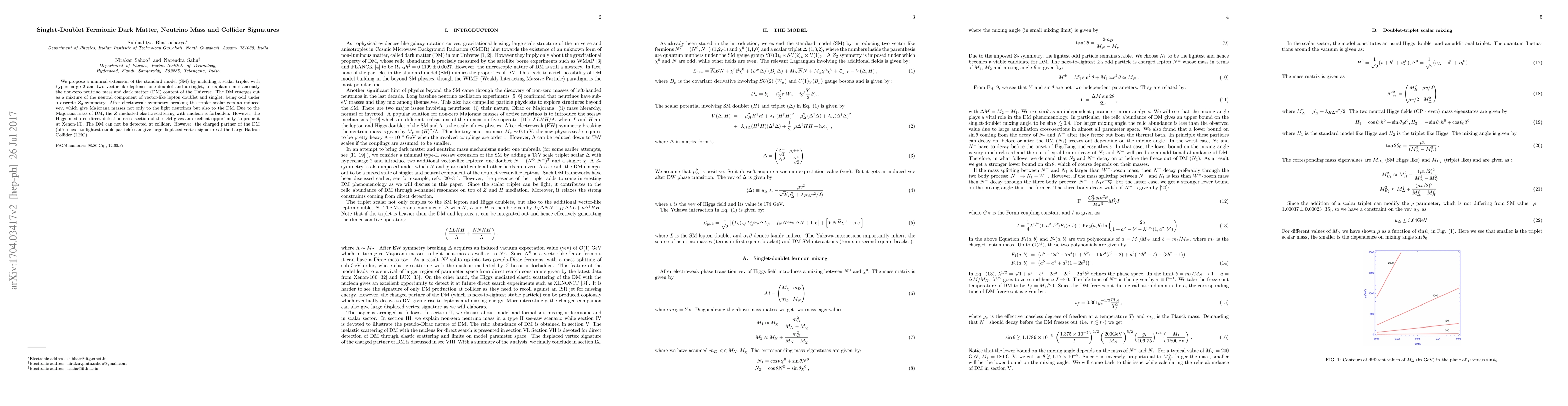 We propose a minimal extension of the standard model (SM) by including a scalar triplet with hypercharge 2 and two vector-like leptons: one doublet and a singlet, to explain simulatenously the non-zero neutrino mass and dark matter (DM) content of the Universe. The DM emerges out as a mixture of the neutral component of vector-like lepton doublet and singlet, being odd under a discrete $Z_2$ symmetry. After electroweak symmetry breaking the triplet scalar gets an induced vev, which give Majorana masses not only to the light neutrinos but also to the DM. Due to the Majorana mass of DM, the $Z$ mediated elastic scattering with nucleon is forbidden. However, the Higgs mediated direct detection cross-section of the DM gives an excellent opportunity to probe it at Xenon-1T. The DM can not be detected at collider. However, the charged partner of the DM (often next-to-lightest stable particle) can give large dispalced vertex signature at the Large Hadron Collider (LHC).