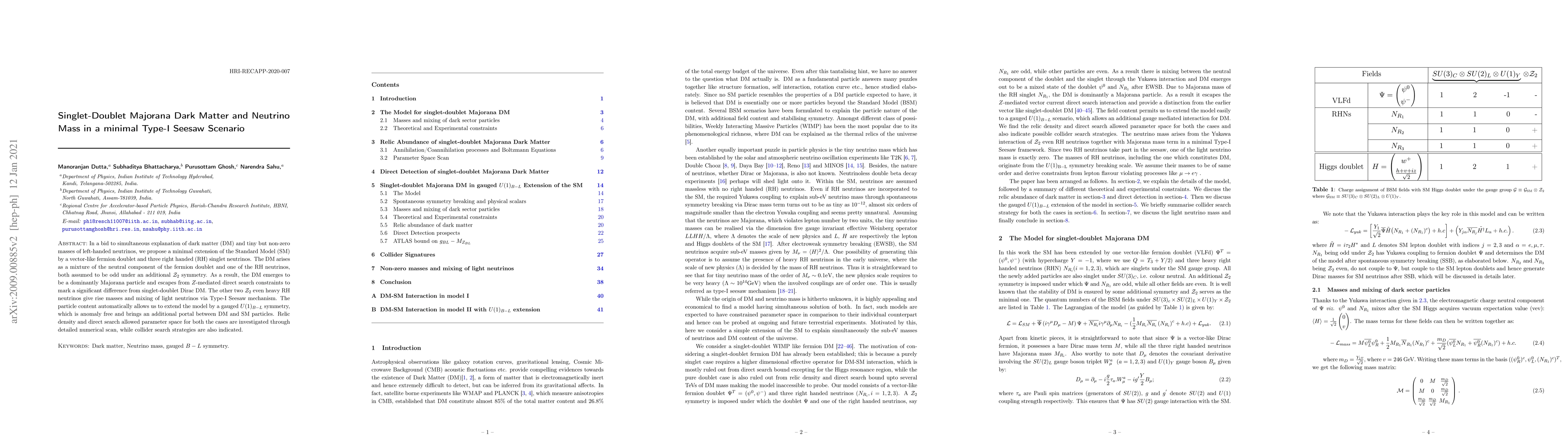 In a bid to simultaneous explanation of dark matter (DM) and tiny but non-zero masses of left-handed neutrinos, we propose a minimal extension of the Standard Model (SM) by a vector-like fermion doublet and three right handed (RH) singlet neutrinos. The DM arises as a mixture of the neutral component of the fermion doublet and one of the RH neutrinos, both assumed to be odd under an additional $\mathcal{Z}_2$ symmetry. As a result, the DM emerges to be a dominantly Majorana particle and escapes from $Z$-mediated direct search constraints to mark a significant difference from singlet-doublet Dirac DM. The other two $\mathcal{Z}_2$ even heavy RH neutrinos give rise masses and mixing of light neutrinos via Type-I Seesaw mechanism. The particle content automatically allows us to extend the model by a gauged $U(1)_{B-L}$ symmetry, which is anomaly free and brings an additional portal between DM and SM particles. Relic density and direct search allowed parameter space for both the cases are investigated through detailed numerical scan, while collider search strategies are also indicated.