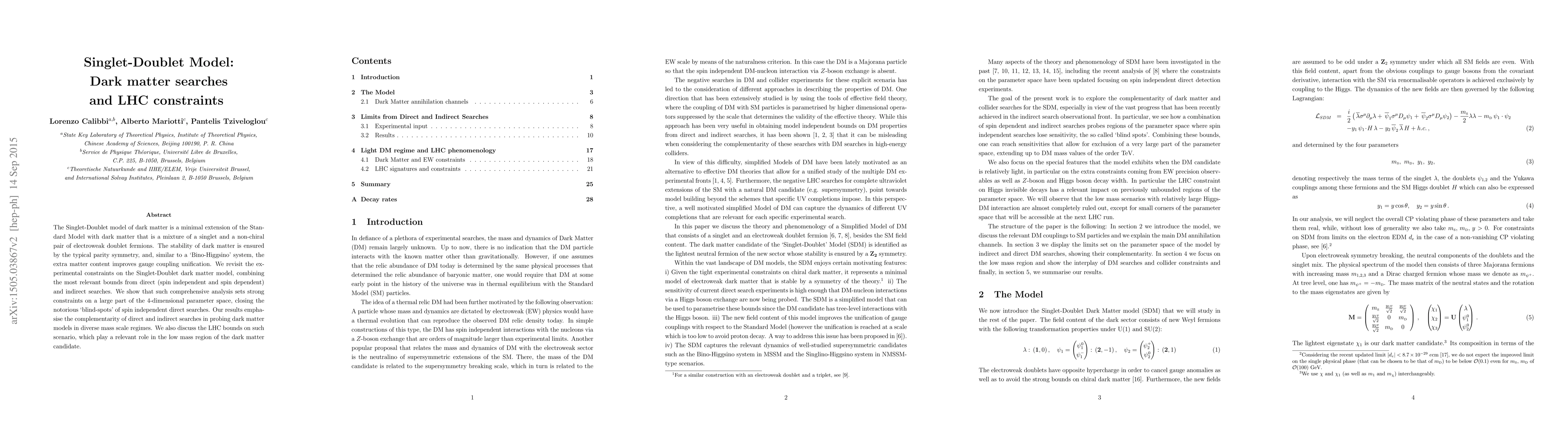 This paper examines the Singlet-Doublet model for dark matter, combining direct and indirect search constraints to close the "blind-spots" in spin independent direct searches. It also highlights the complementary role of LHC constraints, particularly in the low mass region of dark matter candidates.