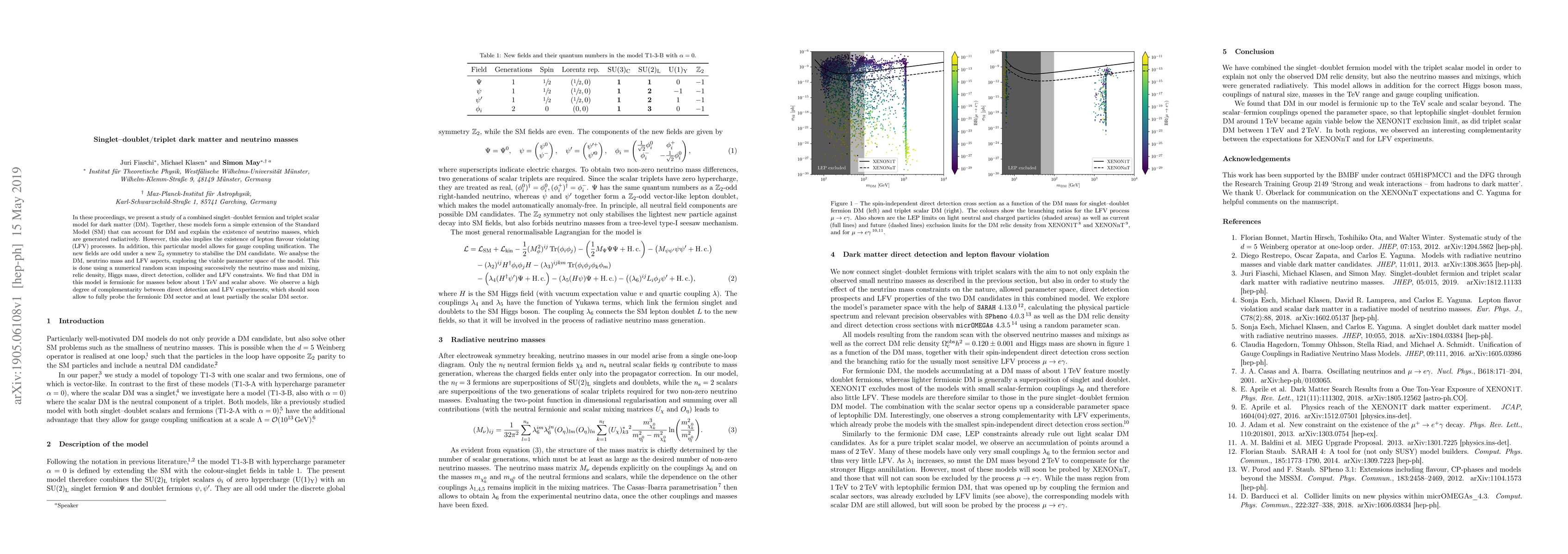 In these proceedings, we present a study of a combined singlet--doublet fermion and triplet scalar model for dark matter (DM). Together, these models form a simple extension of the Standard Model (SM) that can account for DM and explain the existence of neutrino masses, which are generated radiatively. However, this also implies the existence of lepton flavour violating (LFV) processes. In addition, this particular model allows for gauge coupling unification. The new fields are odd under a new $\mathbb{Z}_2$ symmetry to stabilise the DM candidate. We analyse the DM, neutrino mass and LFV aspects, exploring the viable parameter space of the model. This is done using a numerical random scan imposing successively the neutrino mass and mixing, relic density, Higgs mass, direct detection, collider and LFV constraints. We find that DM in this model is fermionic for masses below about 1 TeV and scalar above. We observe a high degree of complementarity between direct detection and LFV experiments, which should soon allow to fully probe the fermionic DM sector and at least partially the scalar DM sector.