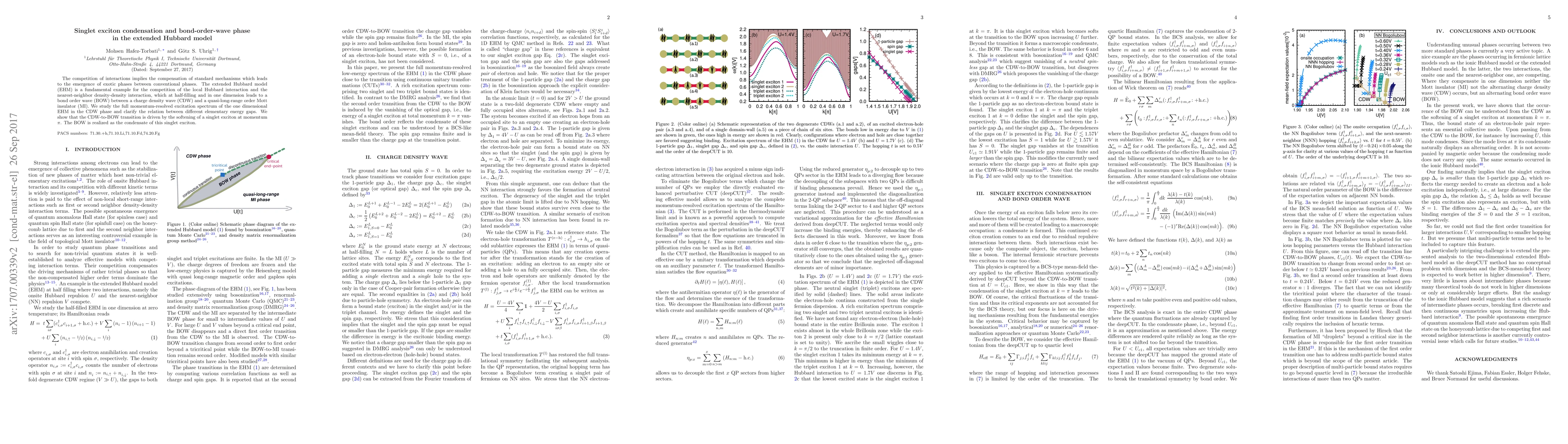 This paper investigates the extended Hubbard model in one dimension, revealing the transition from a charge density wave to a bond-order-wave phase driven by the condensation of a singlet exciton. The study elucidates the momentum-resolved excitation spectrum and the interplay between different elementary energy gaps.