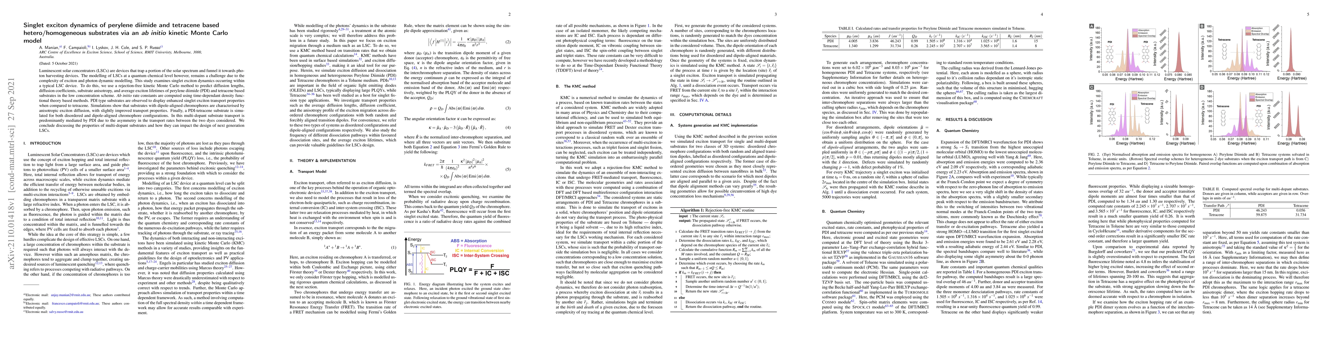 Luminescent solar concentrators (LSCs) are devices that trap a portion of the solar spectrum and funnel it towards photon harvesting devices. The modelling of LSCs at a quantum chemical level however, remains a challenge due to the complexity of exciton and photon dynamic modelling. This study examines singlet exciton dynamics occurring within a typical LSC device. To do this, we use a rejection-free kinetic Monte Carlo method to predict diffusion lengths, diffusion coefficients, substrate anisotropy, and average exciton lifetimes of perylene diimide (PDI) and tetracene based substrates in the low concentration scheme. \textit{Ab initio} rate constants are computed using time-dependant density functional theory based methods. PDI type substrates are observed to display enhanced singlet exciton transport properties when compared to tetracene. Simulations show that substrates with dipole-aligned chromophores are characterised by anisotropic exciton diffusion, with slightly improved transport properties. Finally, a PDI-tetracene substrate is simulated for both disordered and dipole-aligned chromophore configurations. In this multi-dopant substrate transport is predominantly mediated by PDI due to the asymmetry in the transport rates between the two dyes considered. We conclude discussing the properties of multi-dopant substrates and how they can impact the design of next generation LSCs.