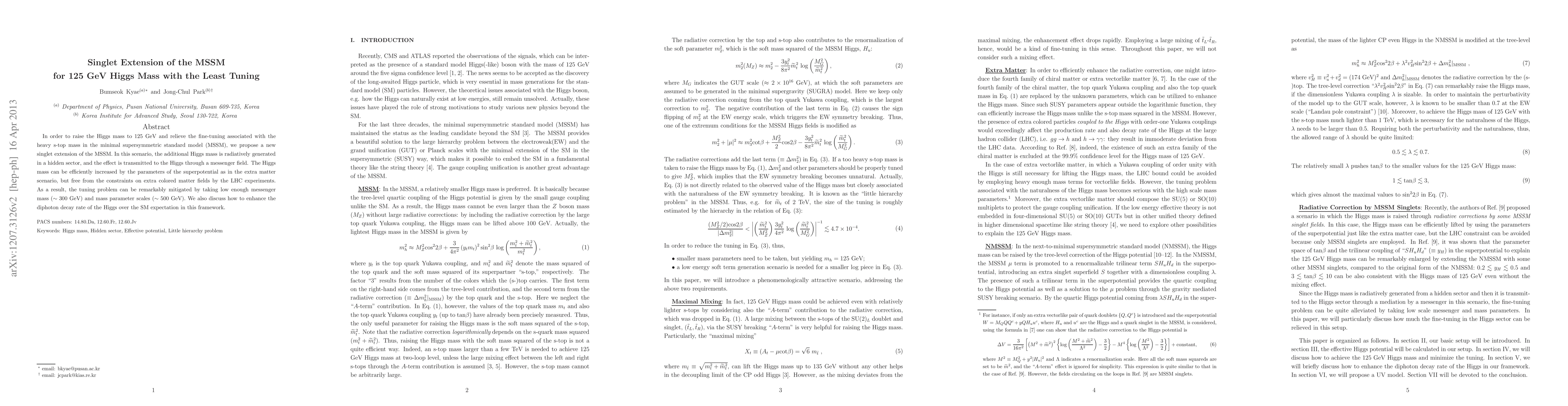This paper proposes a singlet extension of the MSSM to achieve a 125 GeV Higgs mass while minimizing fine-tuning. The extra Higgs mass is radiatively generated via a hidden sector and messenger field, avoiding constraints on extra colored matter fields from LHC experiments.