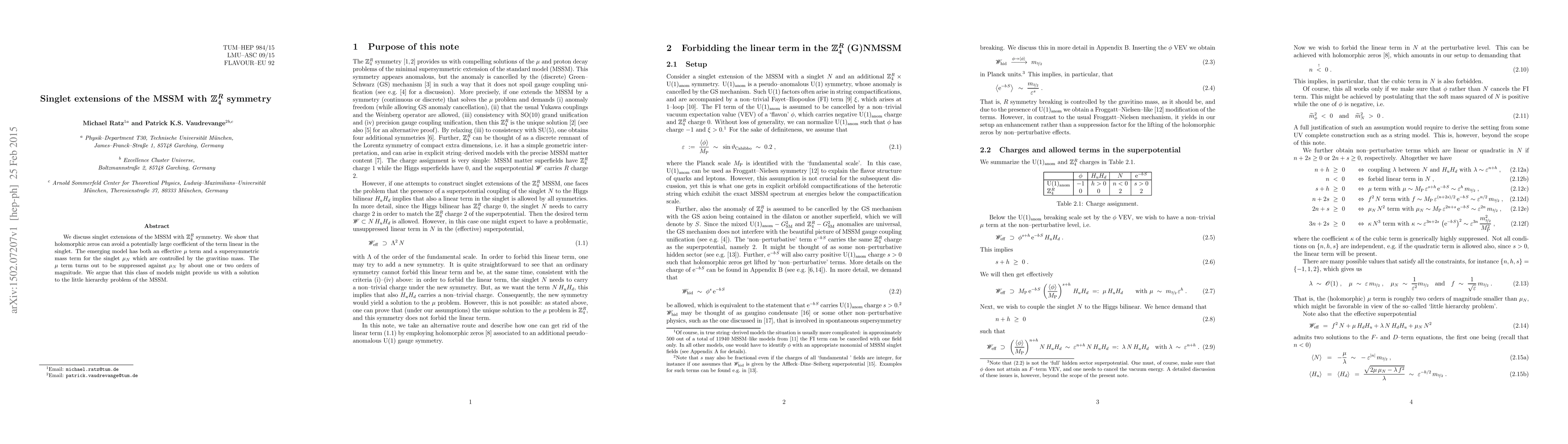 We discuss singlet extensions of the MSSM with $\Z4^R$ symmetry. We show that holomorphic zeros can avoid a potentially large coefficient of the term linear in the singlet. The emerging model has both an effective mu term and a supersymmetric mass term for the singlet mu_N which are controlled by the gravitino mass. The mu term turns out to be suppressed against mu_N by about one or two orders of magnitude. We argue that this class of models might provide us with a solution to the little hierarchy problem of the MSSM.