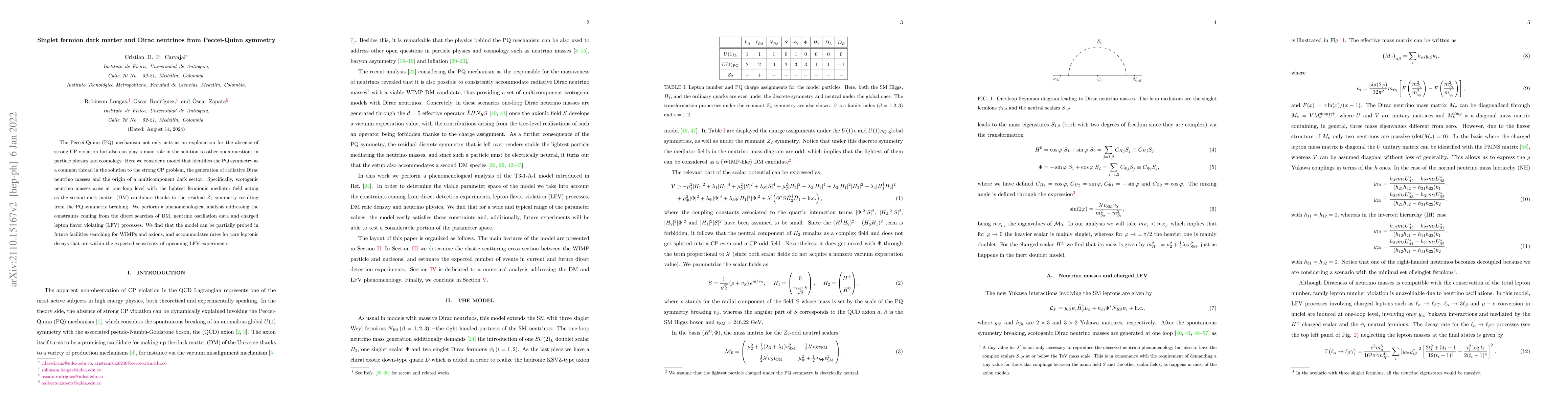 This paper explores a Peccei-Quinn symmetry-based model that addresses the strong CP problem, generates radiative Dirac neutrino masses, and explains a multicomponent dark sector. The model proposes a singlet fermion dark matter candidate alongside Dirac neutrinos, with phenomenological analysis showing potential future detection in WIMP and axion searches, and compatibility with upcoming rare decay experiments.