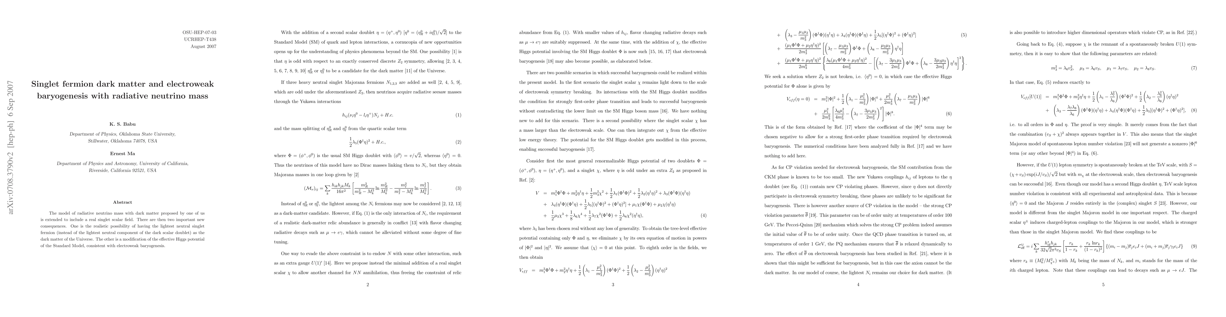 This paper extends a radiative neutrino mass model to include a real singlet scalar field, proposing that a lightest neutral singlet fermion could serve as dark matter. It also modifies the effective Higgs potential, aligning with the requirements for electroweak baryogenesis.