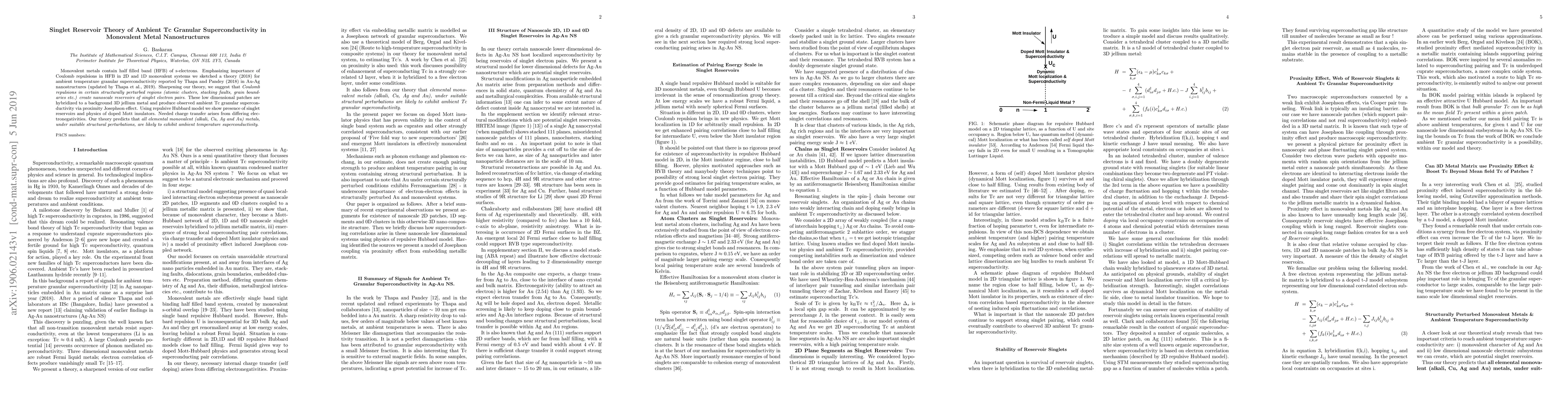 Monovalent metals contain half filled band (HFB) of s-electrons. Emphasizing importance of Coulomb repulsions in HFB in 2D and 1D monovalent systems we sketched a theory (2018) for ambient temperature granular superconductivity reported by Thapa and Pandey (2018) in Au-Ag nanostructures (updated by Thapa et al., 2019). Sharpening our theory, we suggest that \textit{Coulomb repulsions in certain structurally perturbed regions (atomic clusters, stacking faults, grain boundaries etc.) create nanoscale reservoirs of singlet electron pairs}. These low dimensional patches are hybridized to a background 3D jellium metal and produce observed ambient Tc granular superconductivity via proximity Josephson effect. Using repulsive Hubbard model we show presence of singlet reservoirs and physics of doped Mott insulators. Needed charge transfer arises from differing electronegativities. Our theory predicts that \textit{all elemental monovalent (alkali, Cu, Ag and Au) metals, under suitable structural perturbations, are likely to exhibit ambient temperature superconductivity}.