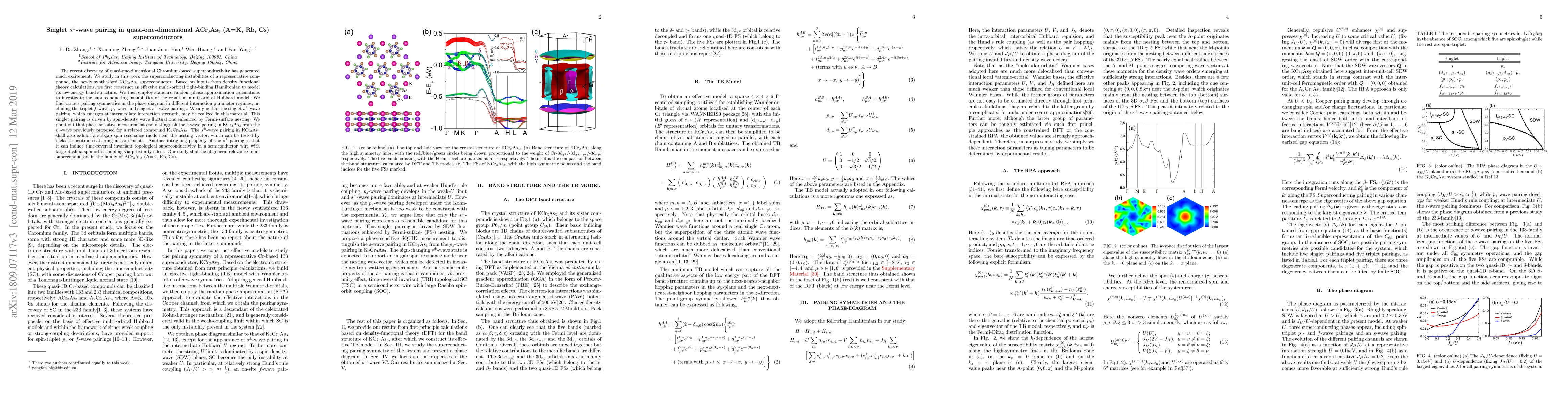 This paper investigates the superconducting pairing symmetries in quasi-one-dimensional ACr$_3$As$_3$ (A=K, Rb, Cs) superconductors, finding that the singlet $s^\pm$-wave pairing is realized in KCr$_3$As$_3$ due to spin-density wave fluctuations. This pairing can be distinguished from other proposed pairings and may induce topological superconductivity in semiconductor wires.