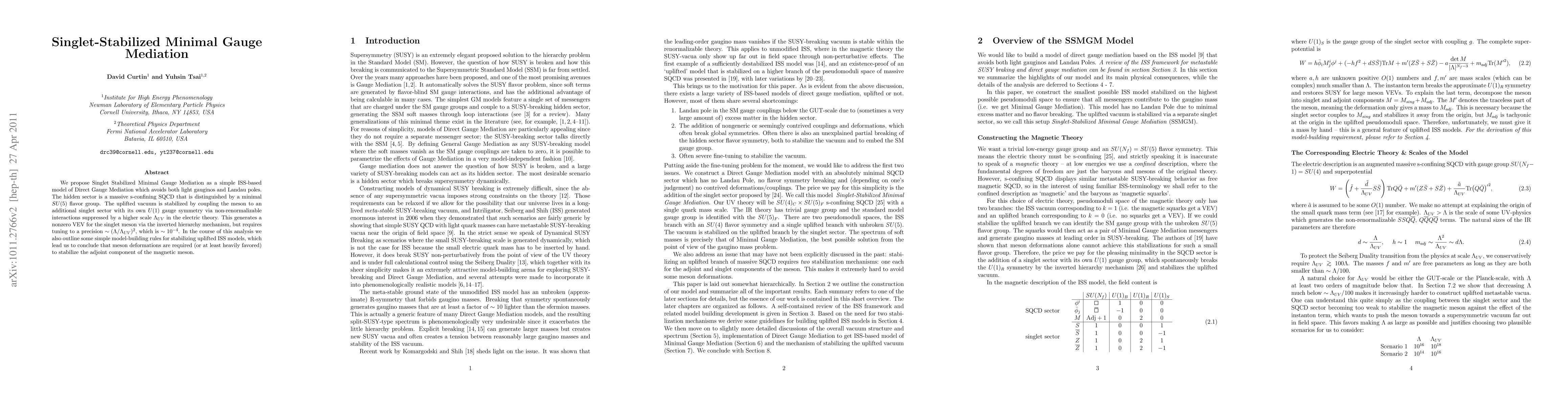 This paper proposes a new model of minimal gauge mediation, termed Singlet Stabilized Minimal Gauge Mediation, which avoids light gauginos and Landau poles by utilizing a massive s-confining SQCD hidden sector with an SU(5) flavor group. The vacuum stabilization involves coupling a meson to a singlet sector with its own U(1) gauge symmetry, requiring precise tuning.