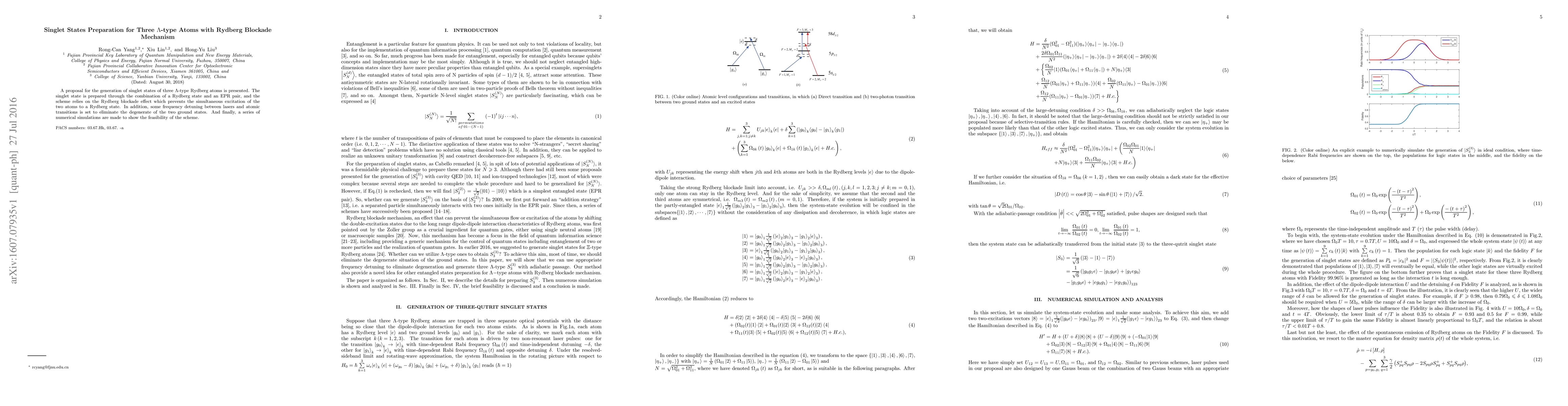 This paper proposes a method for generating singlet states in three $\Lambda$-type Rydberg atoms using Rydberg blockade and EPR pairs, with frequency detuning to avoid ground state degeneracy. Numerical simulations demonstrate the scheme's feasibility.