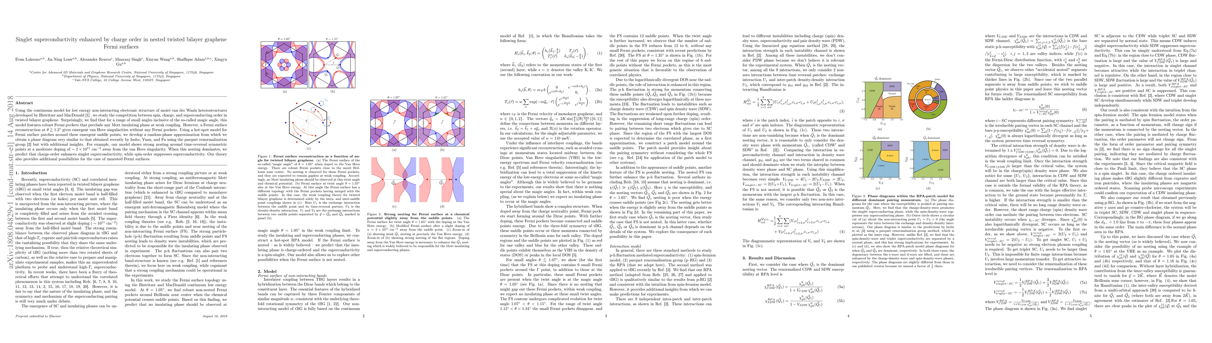 Using the continuum model for low energy non-interacting electronic structure of moir\'e van der Waals heterostructures developed by Bistritzer and MacDonald [1], we study the competition between spin, charge, and superconducting order in twisted bilayer graphene. Surprisingly, we find that for a range of small angles inclusive of the so-called magic angle, this model features robust Fermi pockets that preclude any Mott insulating phase at weak coupling. However, a Fermi surface reconstruction at $\theta \gtrsim 1.2^{\circ}$ gives emergent van Hove singularities without any Fermi pockets. Using a hot-spot model for Fermi surface patches around these emergent saddle points, we develop a random-phase approximation from which we obtain a phase diagram very similar to that obtained recently by Isobe, Yuan, and Fu using the parquet renormalization group [2] but with additional insights. For example, our model shows strong nesting around time-reversal symmetric points at a moderate doping of $\sim 2 \times 10^{11} \text{cm}^{-2}$ away from the van Hove singularity. When this nesting dominates, we predict that charge-order enhances singlet superconductivity, while spin-order suppresses superconductivity. Our theory also provides additional possibilities for the case of unnested Fermi surfaces.