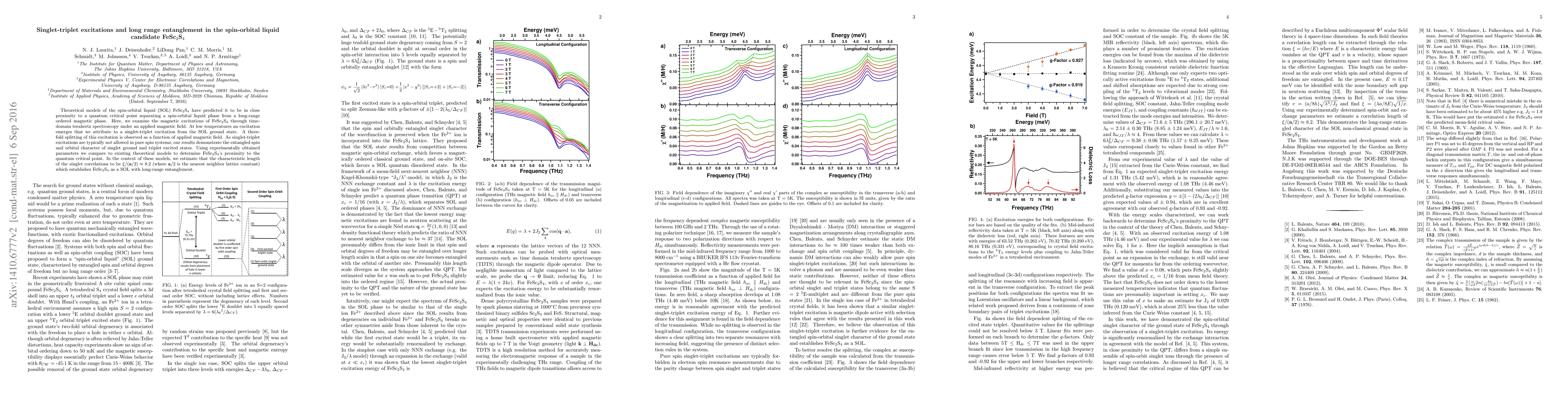 This study investigates the magnetic excitations in FeSc$_2$S$_4$, a spin-orbital liquid candidate, using terahertz spectroscopy. The findings reveal a singlet-triplet excitation indicative of long-range entanglement in the spin-orbital ground state, with a three-fold splitting under magnetic fields, supporting its proximity to a quantum critical point.