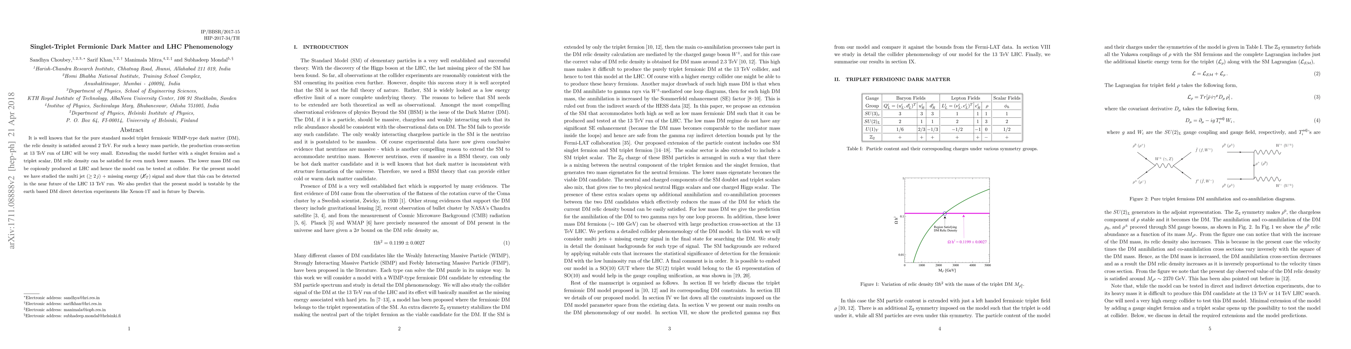 This paper explores a model of singlet-triplet fermionic dark matter that satisfies relic density at lower masses than pure triplet models, enabling its detection at the LHC through multi-jet + missing energy signals. It also predicts the model's testability in near-future LHC runs and in direct detection experiments like Xenon-1T and Darwin.