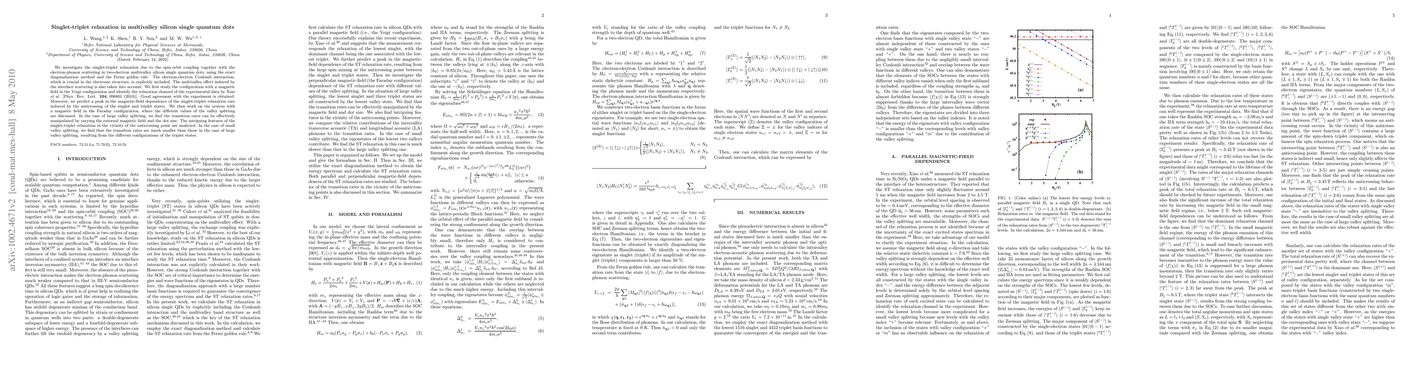 This paper examines the singlet-triplet relaxation in silicon single quantum dots with multivalley effects, employing exact diagonalization and Fermi golden rule. It finds good experimental agreement and predicts a peak in the magnetic-field dependence of relaxation rates due to anticrossing of singlet and triplet states, with varying transition rates dependent on valley splitting and external magnetic field.