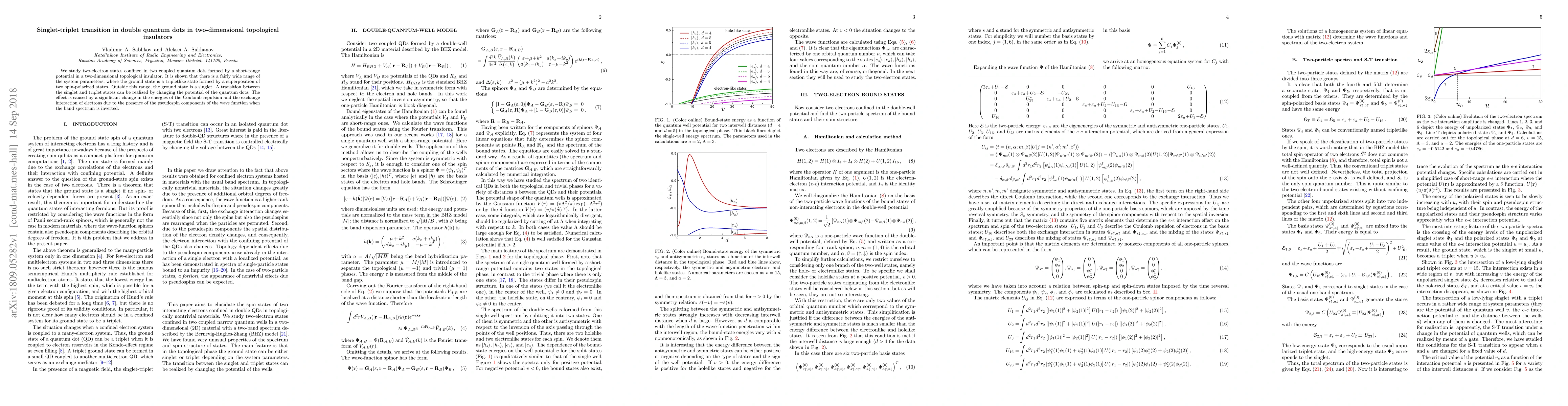 We study two-electron states confined in two coupled quantum dots formed by a short-range potential in a two-dimensional topological insulator. It is shown that there is a fairly wide range of the system parameters, where the ground state is a tripletlike state formed by a superposition of two spin-polarized states. Outside this range, the ground state is a singlet. A transition between the singlet and triplet states can be realized by changing the potential of the quantum dots. The effect is caused by a significant change in the energies of the Coulomb repulsion and the exchange interaction of electrons due to the presence of the pseudospin components of the wave function when the band spectrum is inverted.