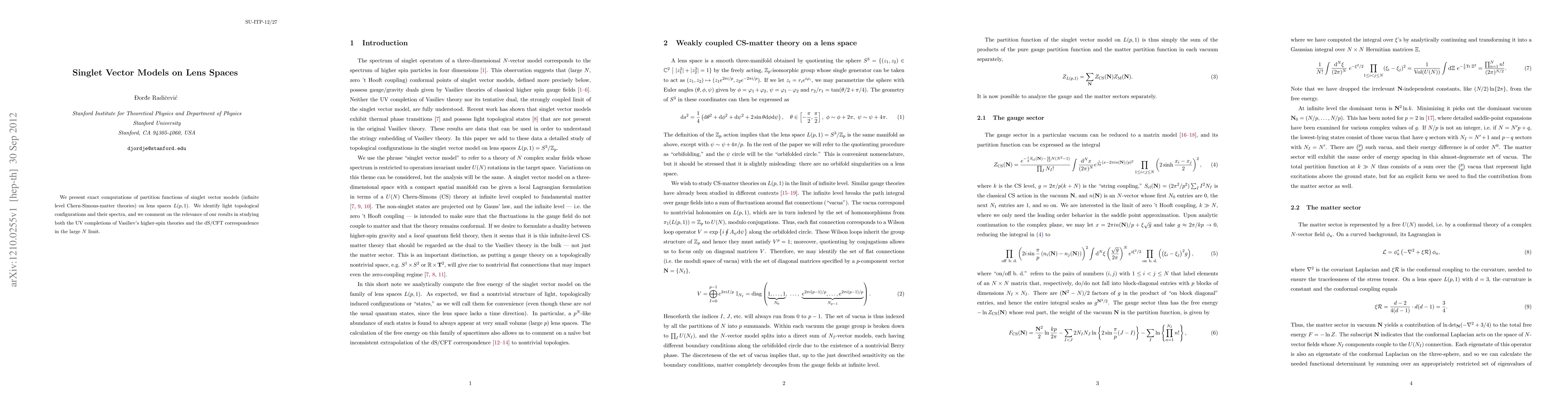We present exact computations of partition functions of singlet vector models (infinite level Chern-Simons-matter theories) on lens spaces L(p, 1). We identify light topological configurations and their spectra, and we comment on the relevance of our results in studying both the UV completions of Vasiliev's higher-spin theories and the dS/CFT correspondence in the large N limit.