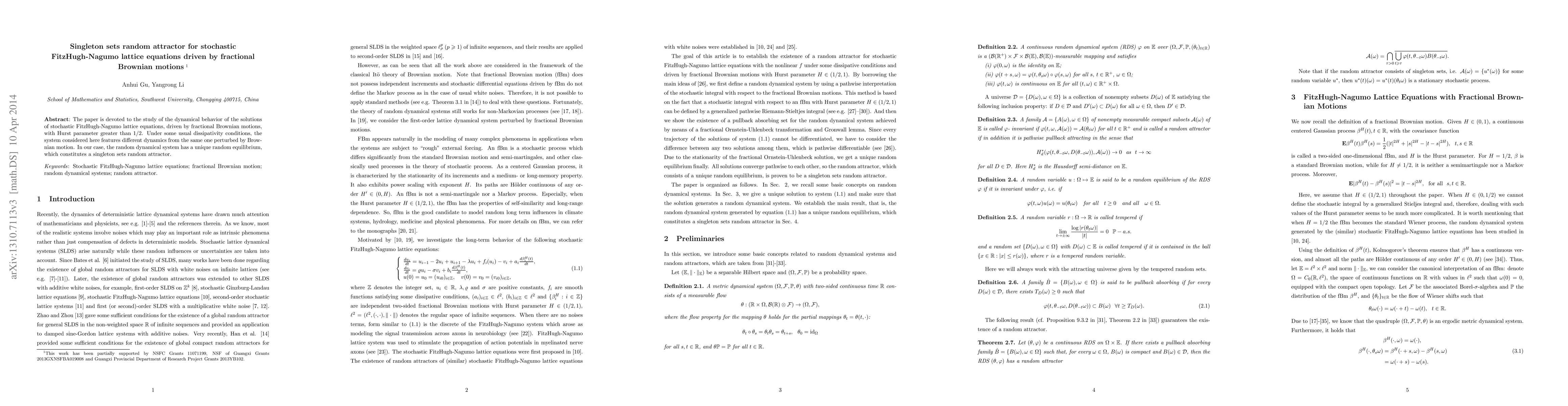The paper investigates the dynamical behavior of stochastic FitzHugh-Nagumo lattice equations driven by fractional Brownian motions with Hurst parameters greater than 1/2. The system exhibits a unique random equilibrium that serves as a singleton sets random attractor, differing from dynamics driven by standard Brownian motion.