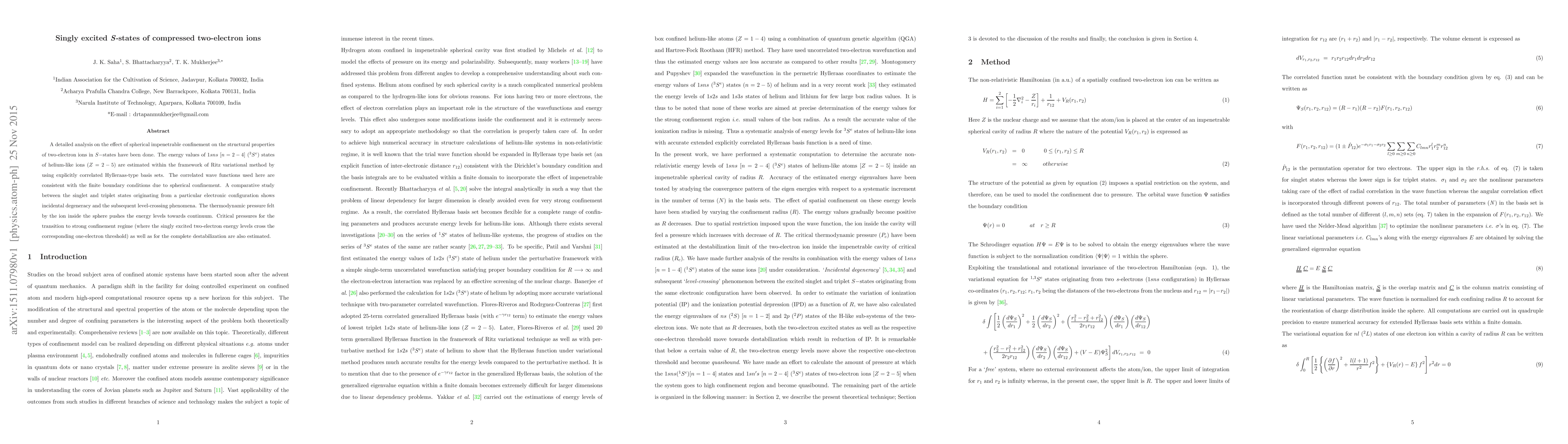 This paper analyzes the structural properties of helium-like ions in S-states under spherical confinement, estimating energy levels using the Ritz variational method and Hylleraas-type basis sets. It finds incidental degeneracy and level-crossing phenomena between singlet and triplet states, and estimates critical pressures for transitions to strong confinement.