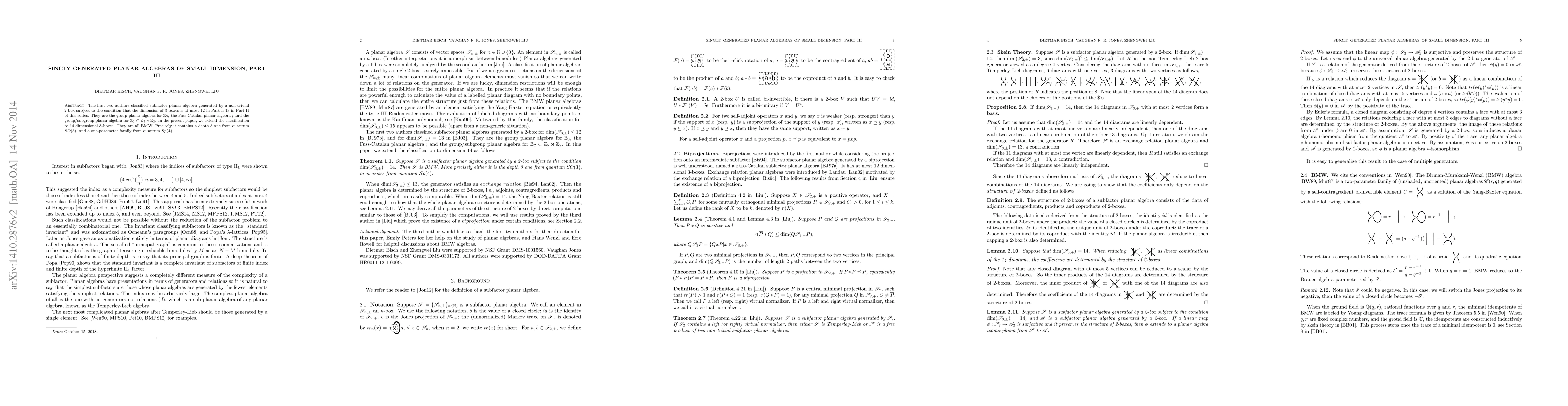 The first two authors classified subfactor planar algebra generated by a non-trivial 2-box subject to the condition that the dimension of 3-boxes is at most 12 in Part I; 13 in Part II of this series. They are the group planar algebra for $\mathbb{Z}_3$, the Fuss-Catalan planar algebra ; and the group/subgroup planar algebra for $\mathbb{Z}_2\subset \mathbb{Z}_5\rtimes \mathbb{Z}_2$. In the present paper, we extend the classification to 14 dimensional 3-boxes. They are all BMW. Precisely it contains a depth 3 one from quantum $SO(3)$, and a one-parameter family from quantum $Sp(4)$.