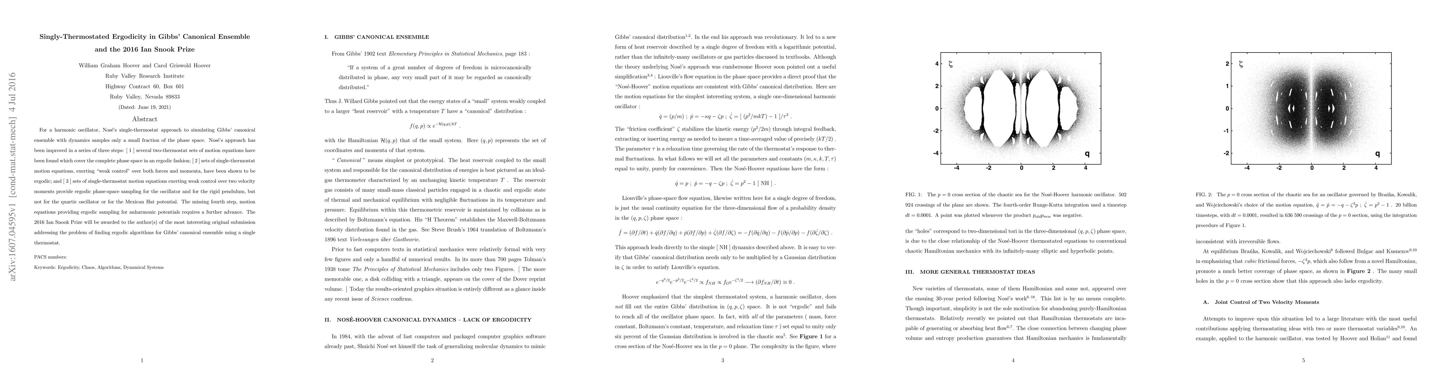 This paper discusses the development of ergodic sampling methods in Gibbs' canonical ensemble using Nosé's single-thermostat approach, highlighting improvements over time but noting the need for further advances to achieve ergodicity for anharmonic potentials. The 2016 Ian Snook Prize will be awarded for the best original submission addressing this challenge.