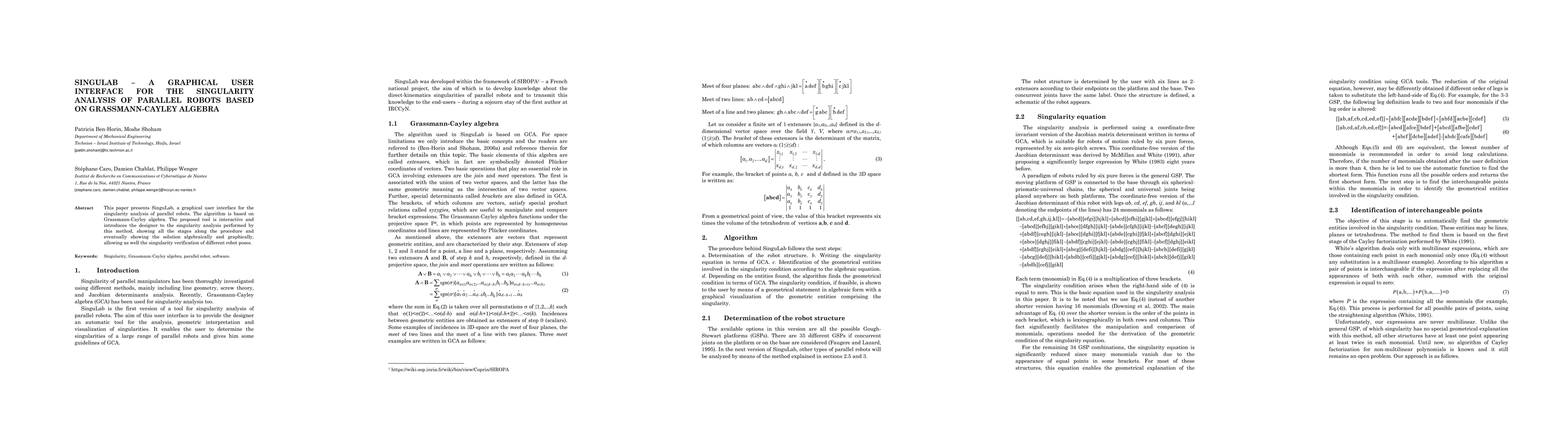 Summary: SinguLab is a graphical user interface for analyzing singularities in parallel robots using Grassmann-Cayley algebra. It provides interactive, step-by-step guidance through the singularity analysis, displaying solutions both algebraically and graphically.
