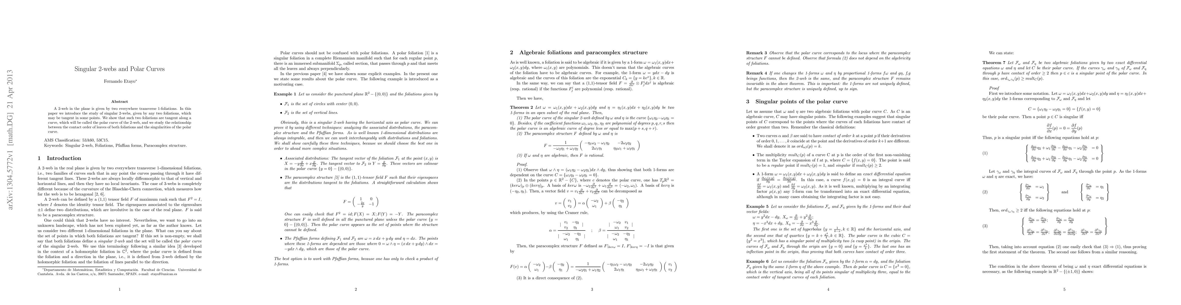 The paper presents the concept of singular 2-webs, defines the polar curve and its properties, and introduces a paracomplex structure associated with the 2-web, providing a comprehensive analysis of their relationships.