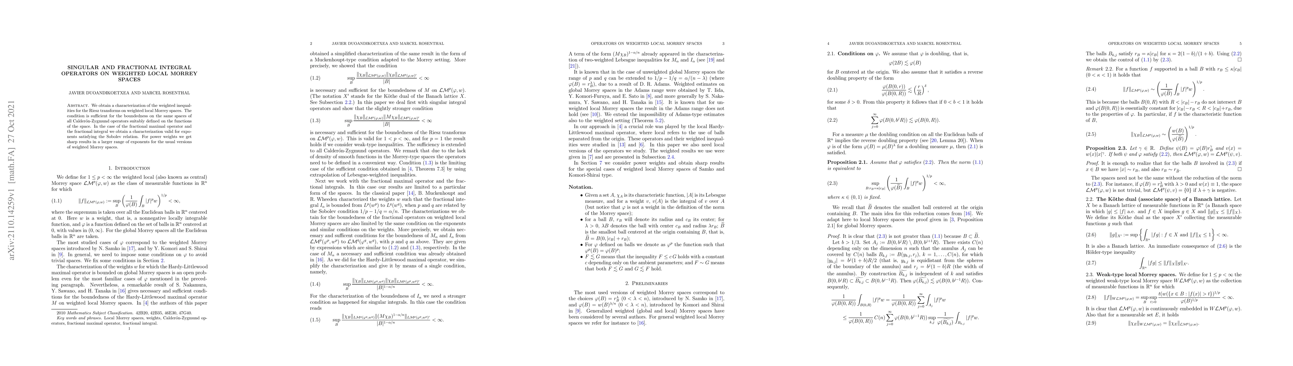 We obtain a characterization of the weighted inequalities for the Riesz transforms on weighted local Morrey spaces. The condition is sufficient for the boundedness on the same spaces of all Calder\'on-Zygmund operators suitably defined on the functions of the space. In the case of the fractional maximal operator and the fractional integral we obtain a characterization valid for exponents satisfying the Sobolev relation. For power weights we get sharp results in a larger range of exponents for the usual versions of weighted Morrey spaces.