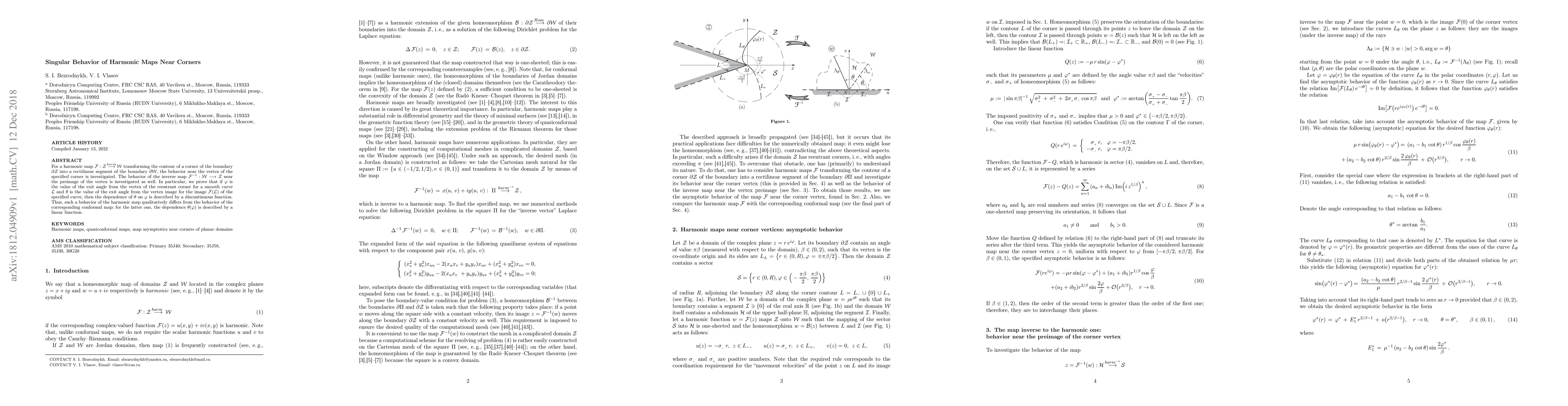 For a harmonic map $\mathcal{F}:\mathcal{Z} {\buildrel {\,harm\,} \over\longrightarrow} \mathcal{W}$ transforming the contour of a corner of the boundary $\partial\mathcal{Z}$ into a rectilinear segment of the boundary $\partial\mathcal{W}$, the behavior near the vertex of the specified corner is investigated. The behavior of the inverse map $\mathcal{F}^{-1}:\mathcal{W} \longrightarrow \mathcal{Z}$ near the preimage of the vertex is investigated as well. In particular, we prove that if $\varphi$ is the value of the exit angle from the vertex of the reentrant corner for a smooth curve $\mathcal{L}$ and $\theta$ is the value of the exit angle from the vertex image for the image $\mathcal{F} (\mathcal{L})$ of the specified curve, then the dependence of $\theta$ on $\varphi$ is described by a discontinuous function.Thus, such a behavior of the harmonic map qualitatively differs from the behavior of the corresponding conformal map: for the latter one, the dependence $\theta (\varphi)$ is described by a linear function.