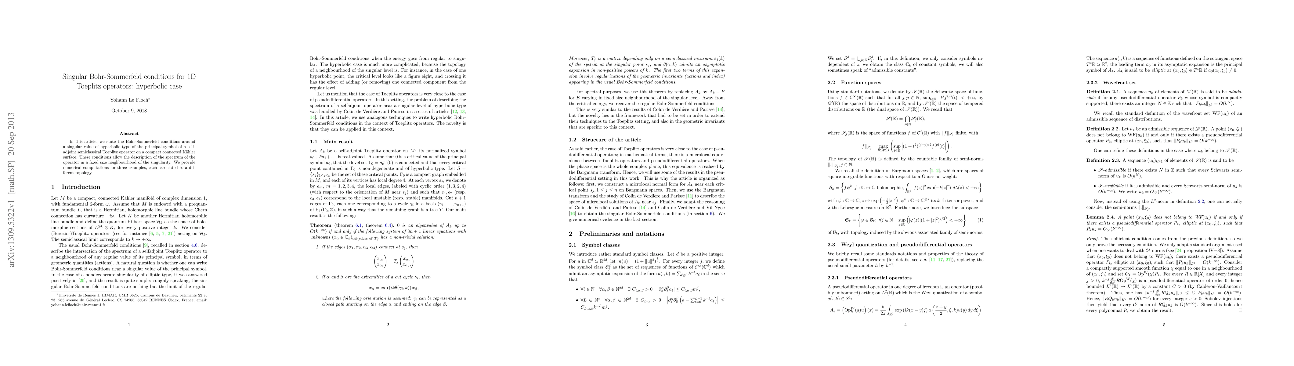 This paper establishes singular Bohr-Sommerfeld conditions for 1D hyperbolic Toeplitz operators on Kähler surfaces, enabling the spectral analysis near singular points. Numerical examples illustrating these conditions are provided for different topological settings.