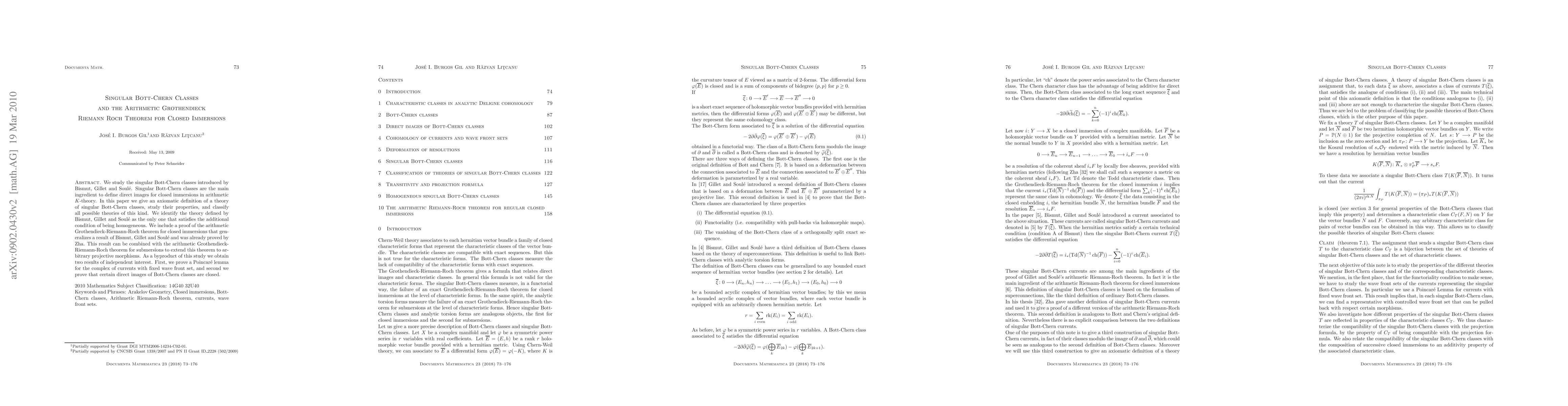 This paper defines and studies singular Bott-Chern classes, proving the arithmetic Grothendieck-Riemann-Roch theorem for closed immersions and identifying the unique homogeneous theory. It also proves a Poincaré lemma for currents and shows that certain direct images of Bott-Chern classes are closed.