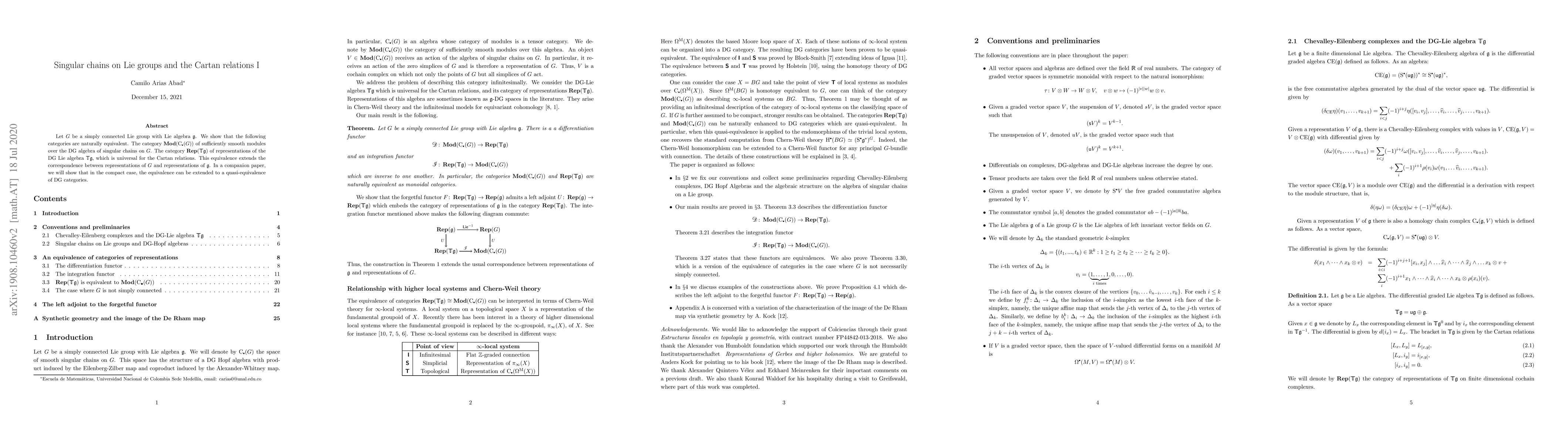 Let $G$ be a simply connected Lie group with Lie algebra $\mathfrak{g}$. We show that the following categories are naturally equivalent. The category $\mathsf{Mod}(C(G))$, of sufficiently smooth modules over the DG-algebra of singular chains on $G$. The category $\mathsf{Rep}(Tg)$ of representations of the DG-Lie algebra $T\mathfrak{g}$, which is universal for the Cartan relations. This equivalence extends the correspondence between representations of $G$ and representations of $\mathfrak{g}$. In a companion paper we show that in the compact case, the equivalence can be extended to an $\mathsf{A}_\infty$ equivalence of DG-categories.