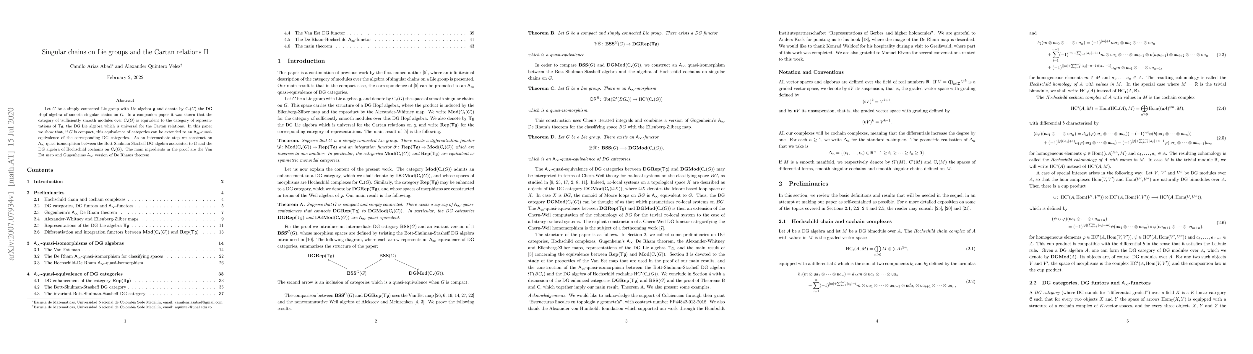 This research paper establishes an $ extsf{A}_{ extinf}$-quasi-equivalence between the category of modules over the DG Hopf algebra of smooth singular chains on a compact Lie group and the category of representations of the universal DG Lie algebra for Cartan relations, extending previous work on equivalence of categories.