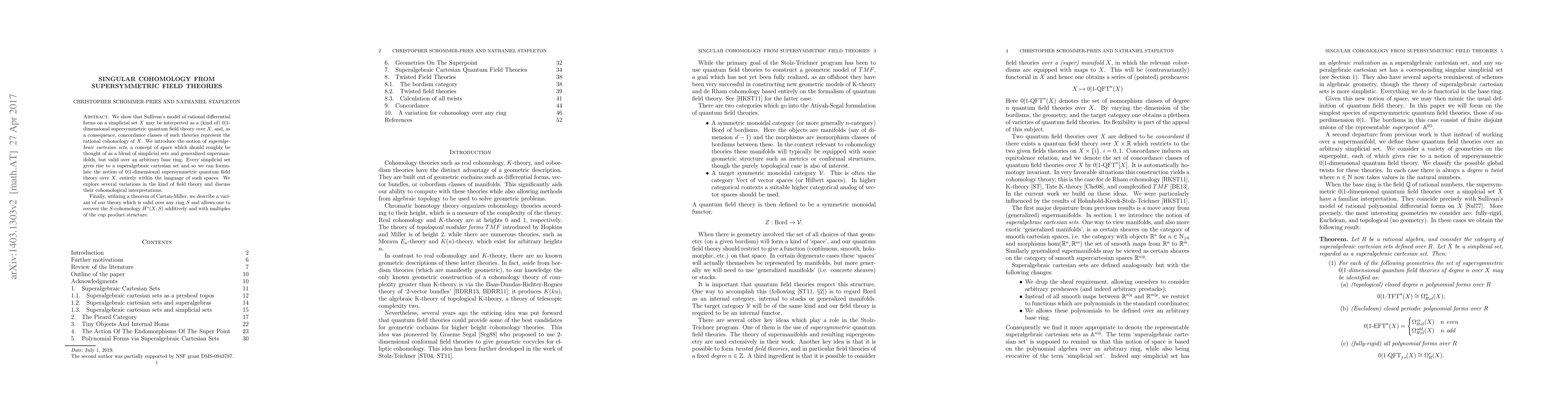 We show that Sullivan's model of rational differential forms on a simplicial set $X$ may be interpreted as a (kind of) $0|1$-dimensional supersymmetric quantum field theory over $X$, and, as a consequence, concordance classes of such theories represent the rational cohomology of $X$. We introduce the notion of superalgebraic cartesian sets, a concept of space which should roughly be thought of as a blend of simplicial sets and generalized supermanifolds, but valid over an arbitrary base ring. Every simplicial set gives rise to a superalgebraic cartesian set and so we can formulate the notion of $0|1$-dimensional supersymmetric quantum field theory over $X$, entirely within the language of such spaces. We explore several variations in the kind of field theory and discuss their cohomological interpretations. Finally, utilizing a theorem of Cartan-Miller, we describe a variant of our theory which is valid over any ring $S$ and allows one to recover the $S$-cohomology $H^*(X;S)$ additively and with multiples of the cup product structure.
