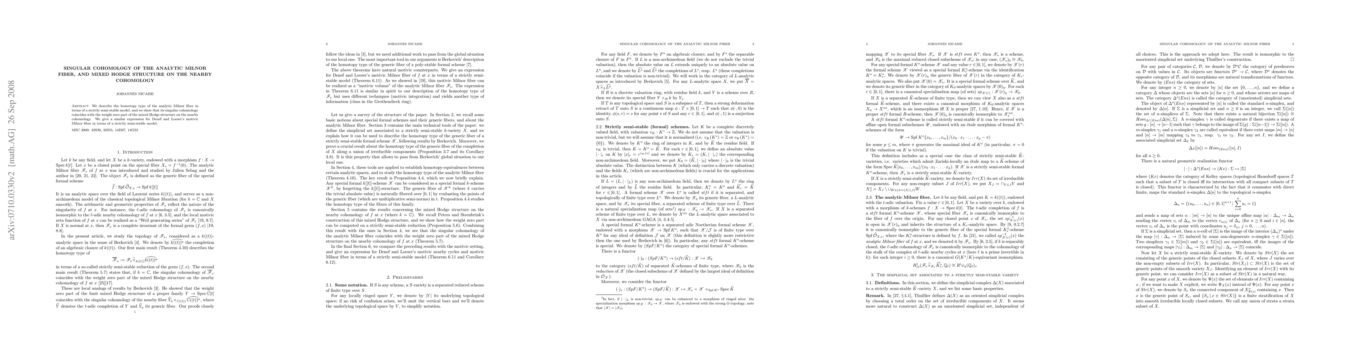 Summary: This paper constructs the analytic Milnor fiber as a non-archimedean model, showing its singular cohomology aligns with the weight zero part of the mixed Hodge structure on nearby cohomology, and extends this result to Denef and Loeser's motivic Milnor fiber.