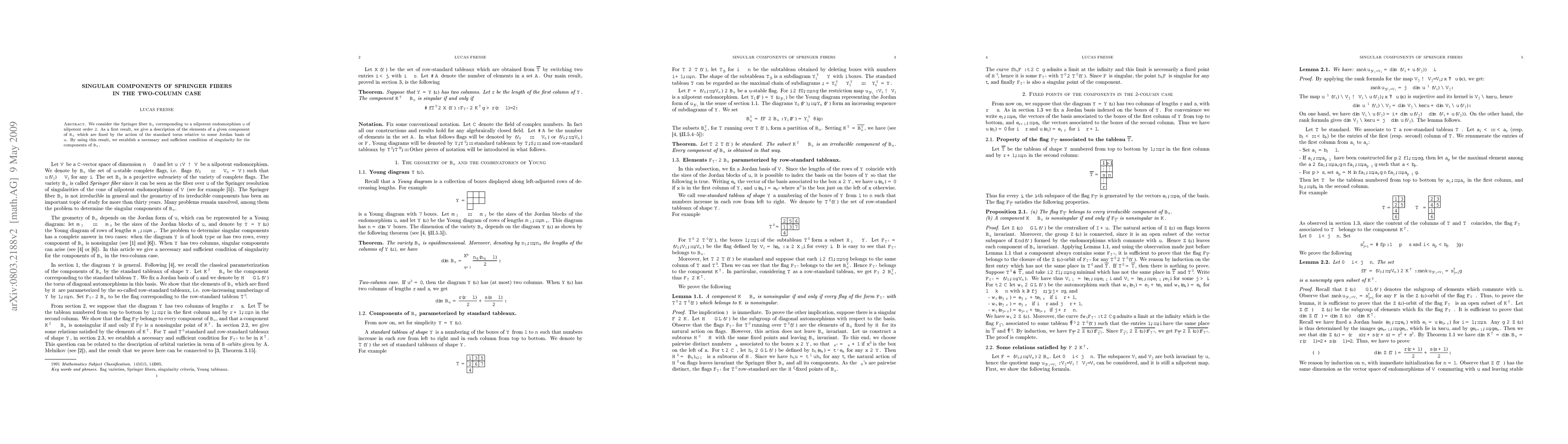 This paper describes the fixed elements of a component of the Springer fiber ${\mathcal B}_u$ under the action of the standard torus, and provides a necessary and sufficient condition for the singularity of these components for a nilpotent endomorphism of nilpotent order 2.
