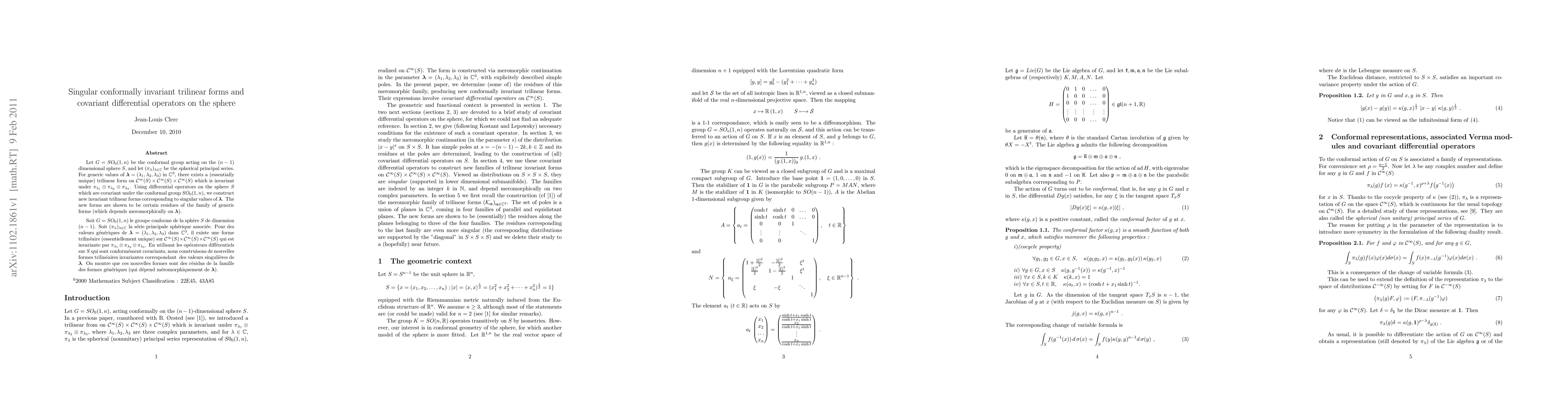 This paper studies singular conformally invariant trilinear forms on the sphere, identifying unique forms for generic parameters and constructing new invariant forms using covariant differential operators, which correspond to singular values and are residues of the generic forms.