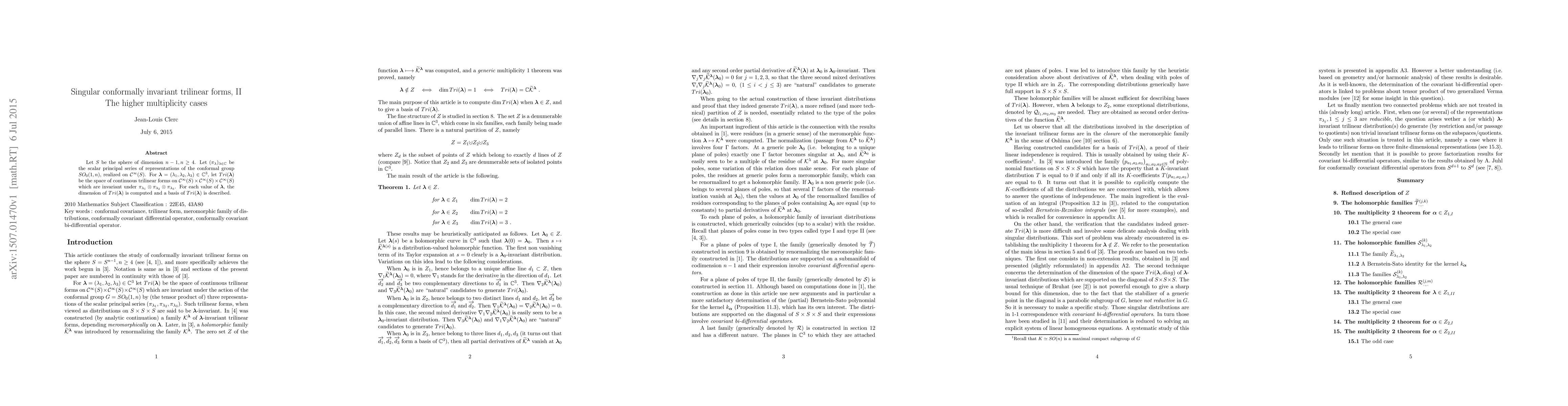 This paper computes the dimensions and describes bases for the spaces of singular conformally invariant trilinear forms on the $(n-1)$-dimensional sphere for higher multiplicity cases, using the scalar principle series representations of the conformal group $SO_0(1,n)$.