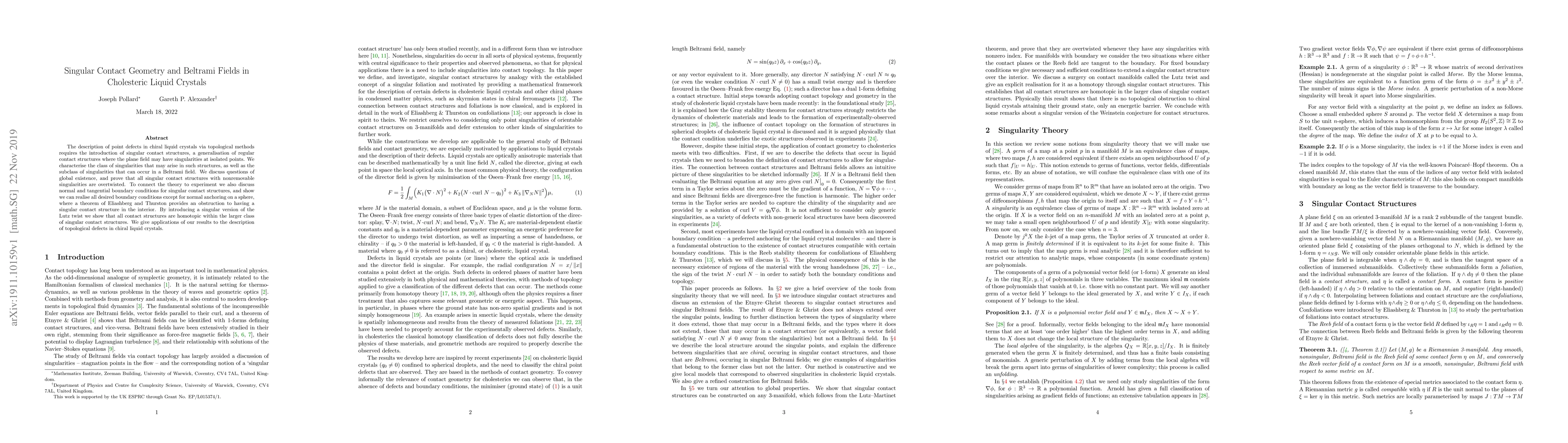 The description of point defects in chiral liquid crystals via topological methods requires the introduction of singular contact structures, a generalisation of regular contact structures where the plane field may have singularities at isolated points. We characterise the class of singularities that may arise in such structures, as well as the subclass of singularities that can occur in a Beltrami field. We discuss questions of global existence, and prove that all singular contact structures with nonremovable singularities are overtwisted. To connect the theory to experiment we also discuss normal and tangential boundary conditions for singular contact structures, and show we can realise all desired boundary conditions except for normal anchoring on a sphere, where a theorem of Eliashberg and Thurston provides an obstruction to having a singular contact structure in the interior. By introducing a singular version of the Lutz twist we show that all contact structures are homotopic within the larger class of singular contact structures. We give applications of our results to the description of topological defects in chiral liquid crystals.
