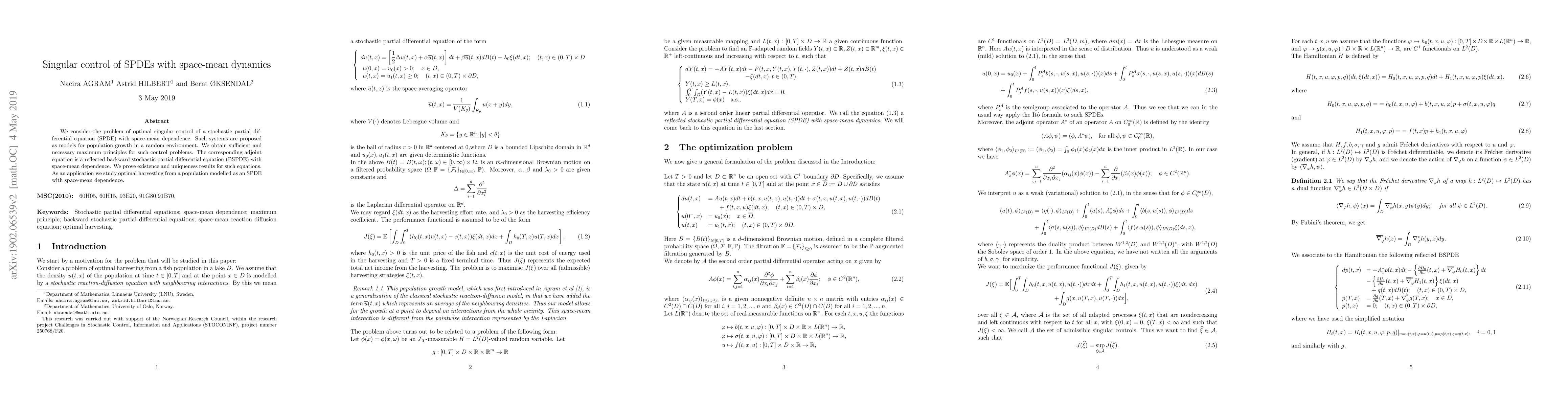 We consider the problem of optimal singular control of a stochastic partial differential equation (SPDE) with space-mean dependence. Such systems are proposed as models for population growth in a random environment. We obtain sufficient and necessary maximum principles for such control problems. The corresponding adjoint equation is a reflected backward stochastic partial differential equation (BSPDE) with space-mean dependence. We prove existence and uniqueness results for such equations. As an application we study optimal harvesting from a population modelled as an SPDE with space-mean dependence.