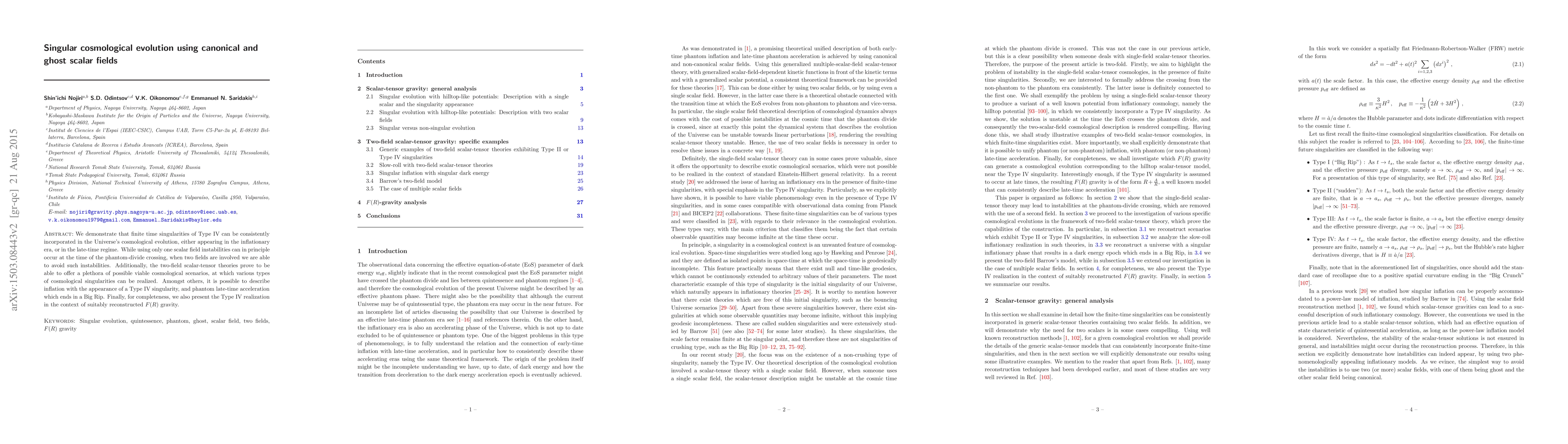 This paper explores the incorporation of Type IV singularities in cosmological evolution using canonical and phantom scalar fields, demonstrating that two-field scalar-tensor theories can avoid instabilities and provide diverse viable cosmological scenarios, including inflation and phantom-driven late-time acceleration ending in a Big Rip. It also presents Type IV singularities within the framework of $F(R)$ gravity.