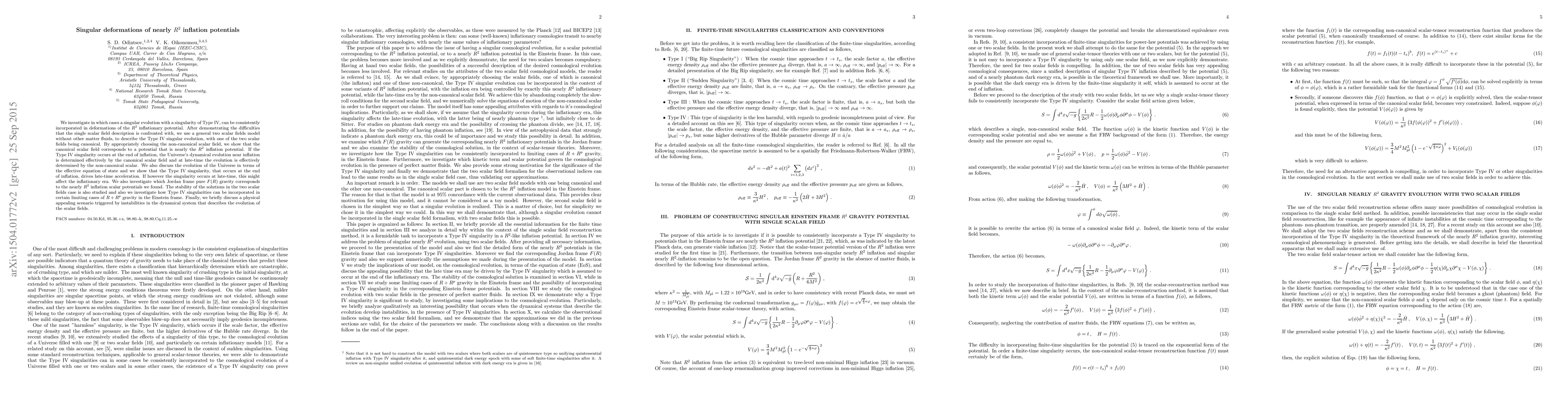We investigate in which cases a singular evolution with a singularity of Type IV, can be consistently incorporated in deformations of the $R^2$ inflationary potential. After demonstrating the difficulties that the single scalar field description is confronted with, we use a general two scalar fields model without other matter fluids, to describe the Type IV singular evolution, with one of the two scalar fields being canonical. By appropriately choosing the non-canonical scalar field, we show that the canonical scalar field corresponds to a potential that is nearly the $R^2$ inflation potential. If the Type IV singularity occurs at the end of inflation, the Universe's dynamical evolution near inflation is determined effectively by the canonical scalar field and at late-time the evolution is effectively determined by the non-canonical scalar. We also discuss the evolution of the Universe in terms of the effective equation of state and we show that the Type IV singularity, that occurs at the end of inflation, drives late-time acceleration. If however the singularity occurs at late-time, this might affect the inflationary era. We also investigate which Jordan frame pure $F(R)$ gravity corresponds to the nearly $R^2$ inflation scalar potentials we found. The stability of the solutions in the two scalar fields case is also studied and also we investigate how Type IV singularities can be incorporated in certain limiting cases of $R+R^p$ gravity in the Einstein frame. Finally, we briefly discuss a physical appealing scenario triggered by instabilities in the dynamical system that describes the evolution of the scalar fields.