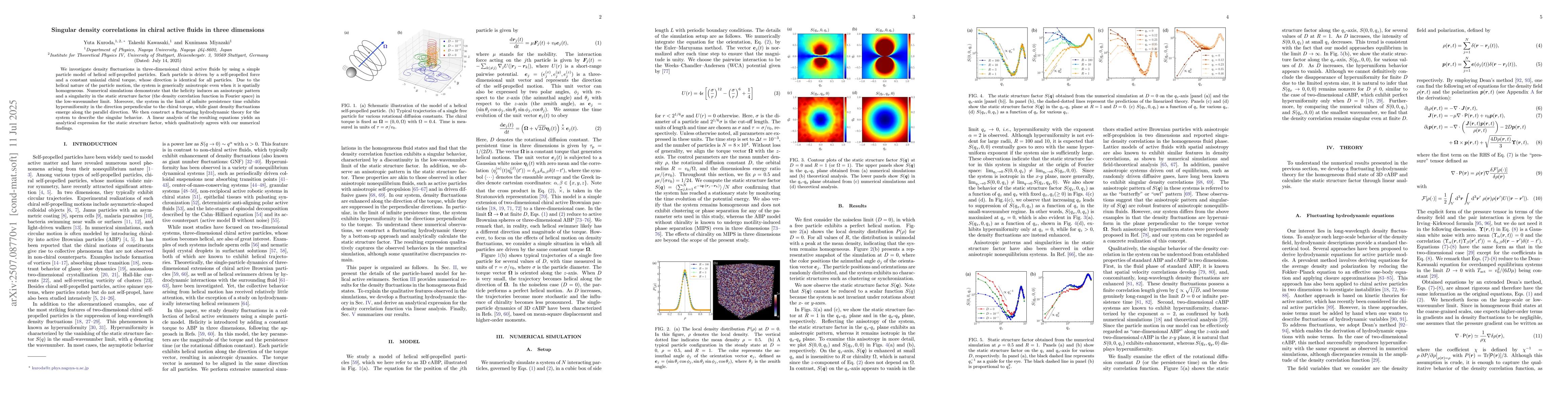 We investigate density fluctuations in three-dimensional chiral active fluids by using a simple particle model of helical self-propelled particles. Each particle is driven by a self-propelled force and a constant uniaxial chiral torque, whose direction is identical for all particles. Due to the helical nature of the particle motion, the system is generically anisotropic even when it is spatially homogeneous. Numerical simulations demonstrate that the helicity induces an anisotropic pattern and a singularity in the static structure factor (the density correlation function in Fourier space) in the low-wavenumber limit. Moreover, the system in the limit of infinite persistence time exhibits hyperuniformity in the direction perpendicular to the chiral torque, while giant density fluctuations emerge along the parallel direction. We then construct a fluctuating hydrodynamic theory for the system to describe the singular behavior. A linear analysis of the resulting equations yields an analytical expression for the static structure factor, which qualitatively agrees with our numerical findings.