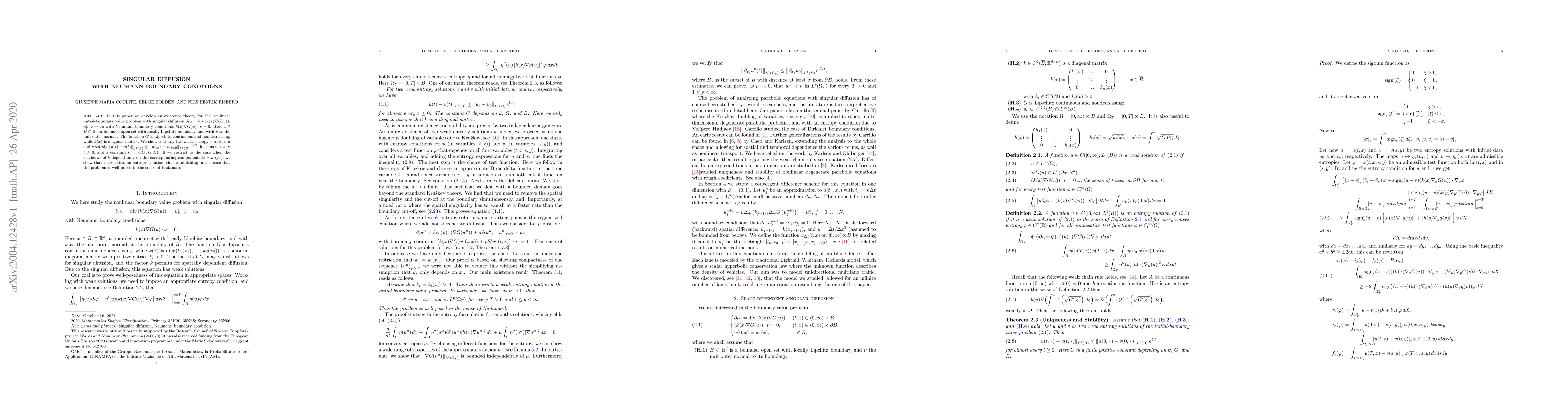 In this paper we develop an existence theory for the nonlinear initial-boundary value problem with singular diffusion $\partial_t u = \text{div}(k(x)\nabla G(u))$, $u|_{t=0}=u_0$ with Neumann boundary conditions $k(x)\nabla G(u)\cdot \nu = 0$. Here $x\in B\subset \mathbb{R}^d$, a bounded open set with locally Lipchitz boundary, and with $\nu$ as the unit outer normal. The function $G$ is Lipschitz continuous and nondecreasing, while $k(x)$ is diagonal matrix. We show that any two weak entropy solutions $u$ and $v$ satisfy $\Vert{u(t)-v(t)}\Vert_{L^1(B)}\le \Vert{u|_{t=0}-v|_{t=0}}\Vert_{L^1(B)}e^{Ct}$, for almost every $t\ge 0$, and a constant $C=C(k,G,B)$. If we restrict to the case when the entries $k_i$ of $k$ depend only on the corresponding component, $k_i=k_i(x_i)$, we show that there exists an entropy solution, thus establishing in this case that the problem is well-posed in the sense of Hadamard.